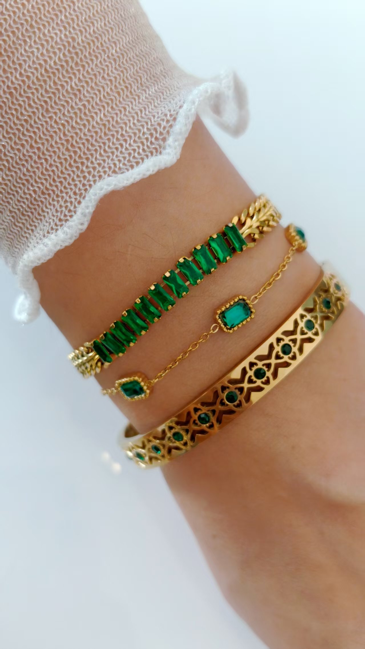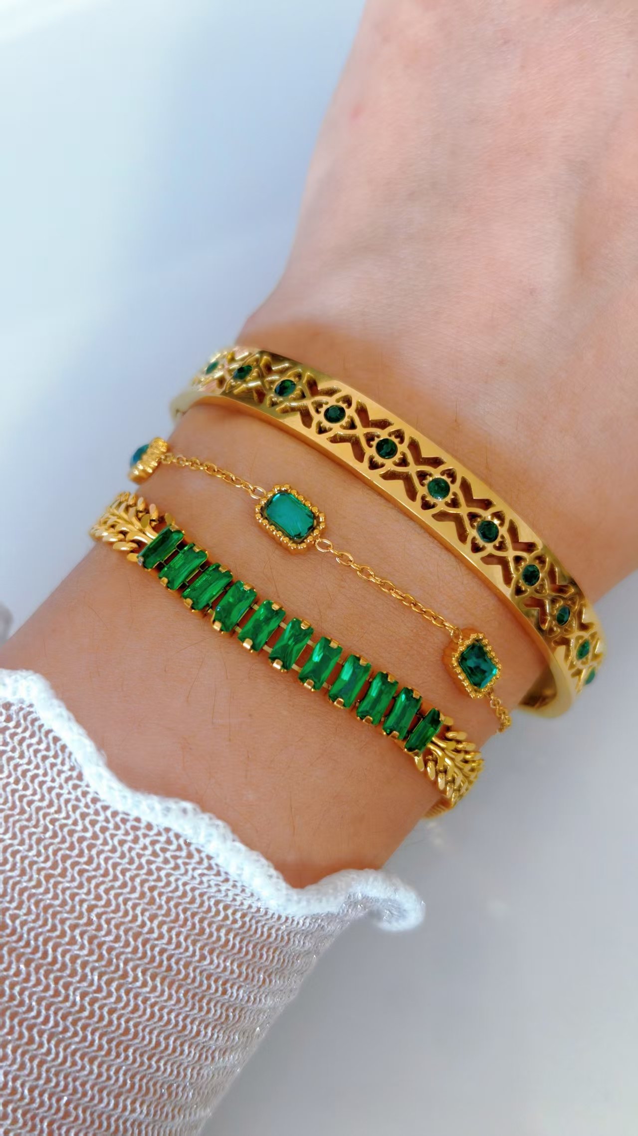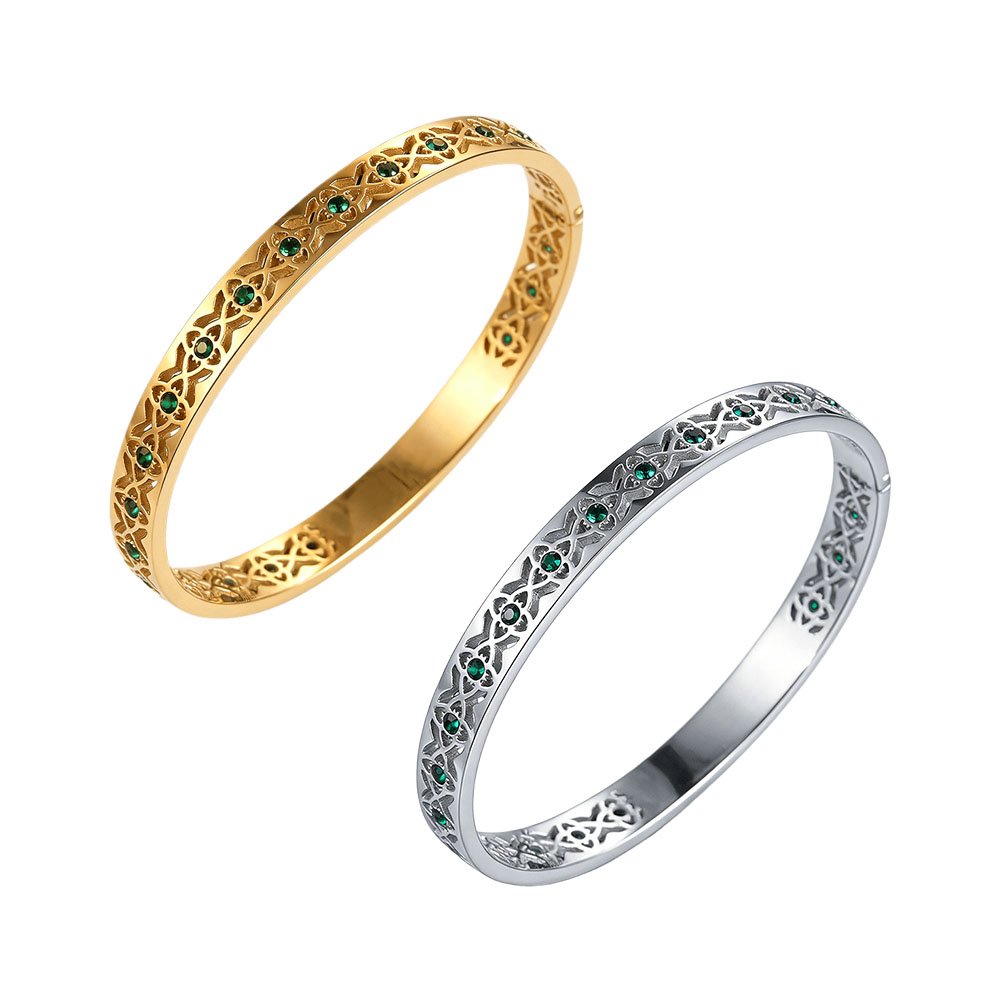 💚 Filigree Craftsmanship That Stops Time The cutwork on this bangle is genuinely remarkable. The entire band is carved with a repeating open-lace pattern of four-leaf clover florals connected by delicate interlacing X-shaped lattice links — a design that echoes the intricate hand-engraved metalwork of antique jewelry houses and cathedral ironwork alike. The negative space between each motif creates a beautiful lace-like transparency that makes the bangle appear impossibly intricate and artisanal, as though each piece was individually hand-crafted by a master goldsmith. At the center of every clover bloom, a single round emerald zircon is set flush and deep — their rich, jewel-toned green creating a color story that is lush, regal, and completely captivating against both the warm gold and cool silver finishes.