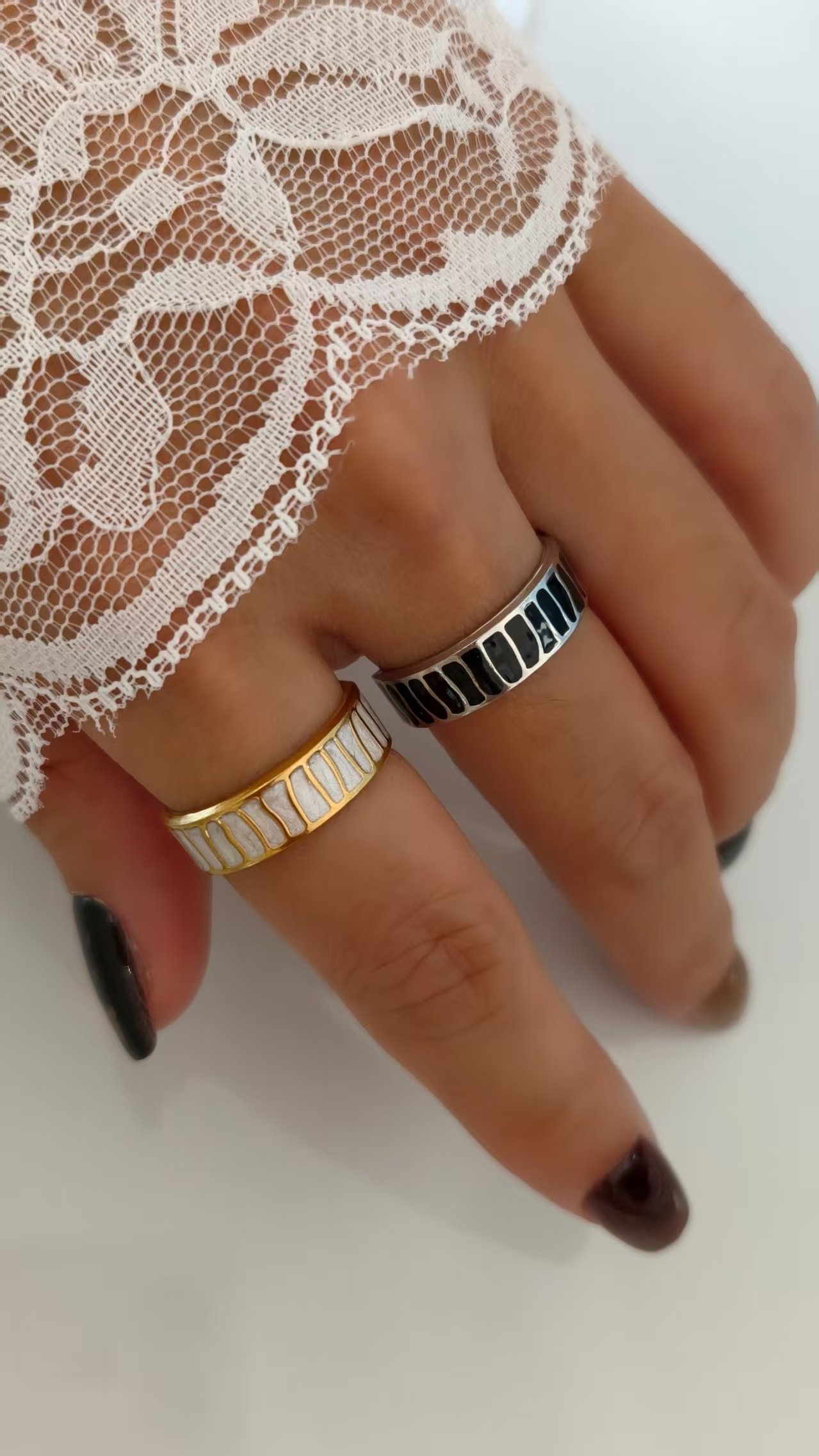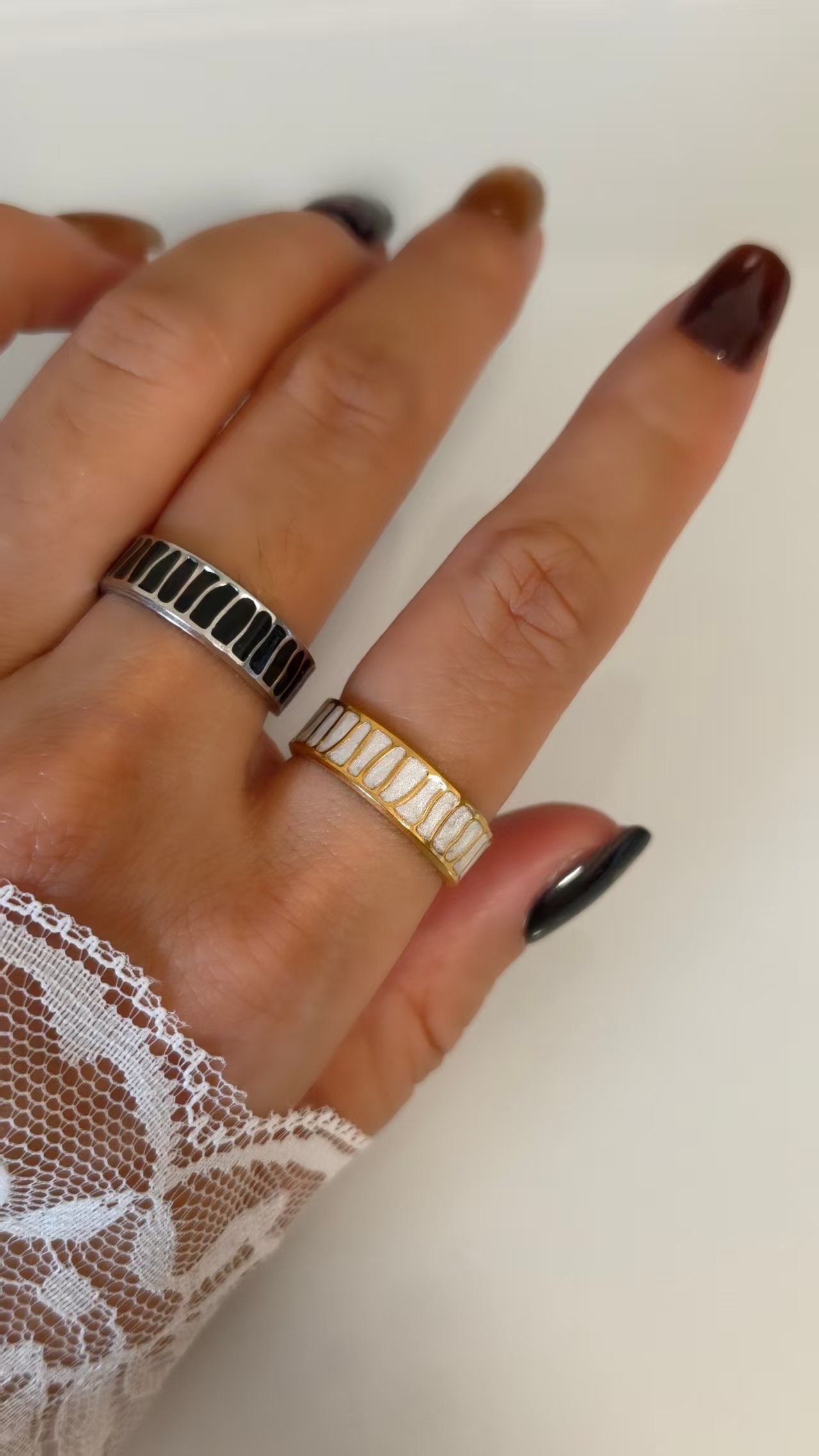 Choose between glossy white enamel for a soft, luminous glow or deep black enamel for a striking monochrome contrast. Each enamel segment is hand-applied to create a rhythmic groove pattern that catches the eye from every angle. It’s the perfect everyday ring that still feels uniquely artistic.