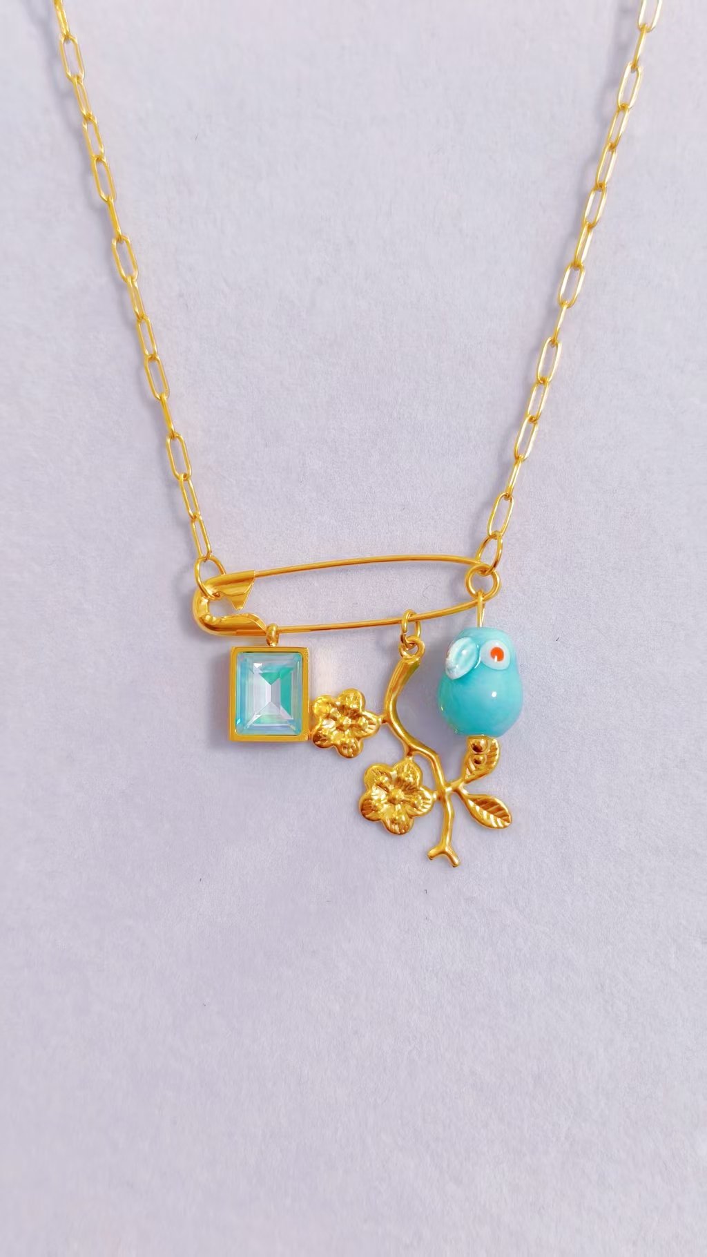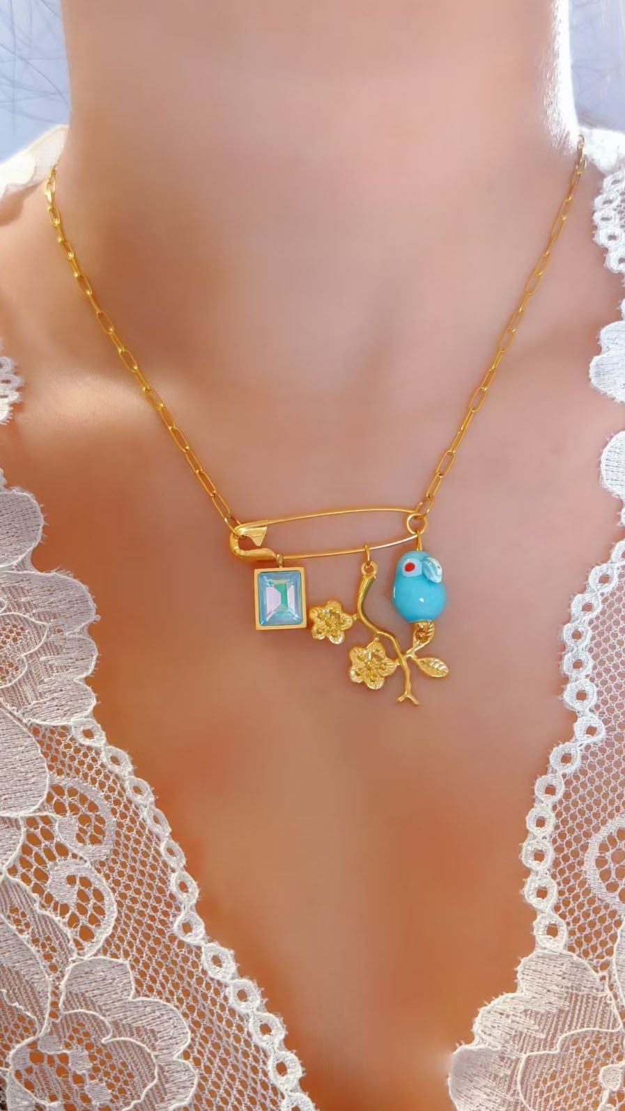 Feel the high-end magic in the details – the warm 18K gold plating contrasts beautifully with the vibrant turquoise bird, soft enamel flower, and brilliant faceted gemstone, creating depth, color, and irresistible movement with every turn. The modern safety-pin bar adds an edgy, contemporary twist while the adjustable chain ensures perfect draping whether layered or worn alone. Lightweight, comfortable, and utterly unique, this charm necklace blends whimsical charm with refined designer vibes – the kind of piece that sparks compliments and makes you feel like you’re wearing a tiny piece of enchanted nature!