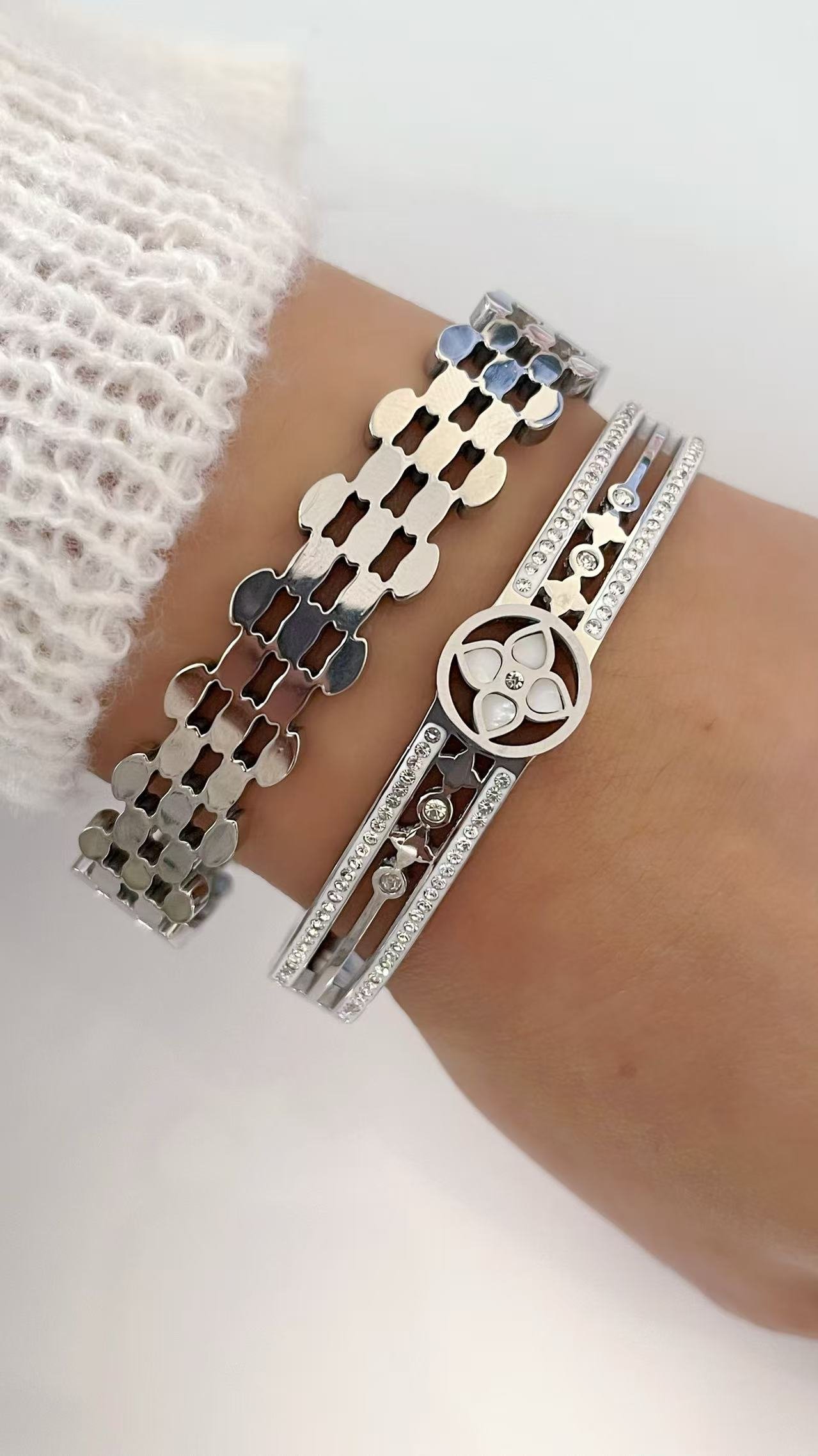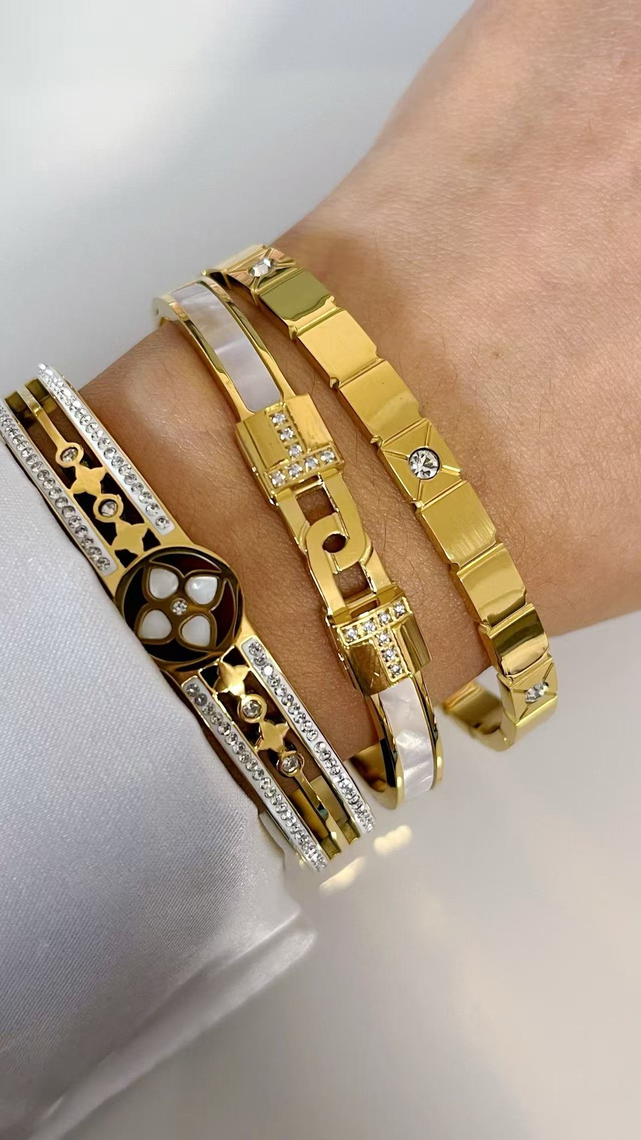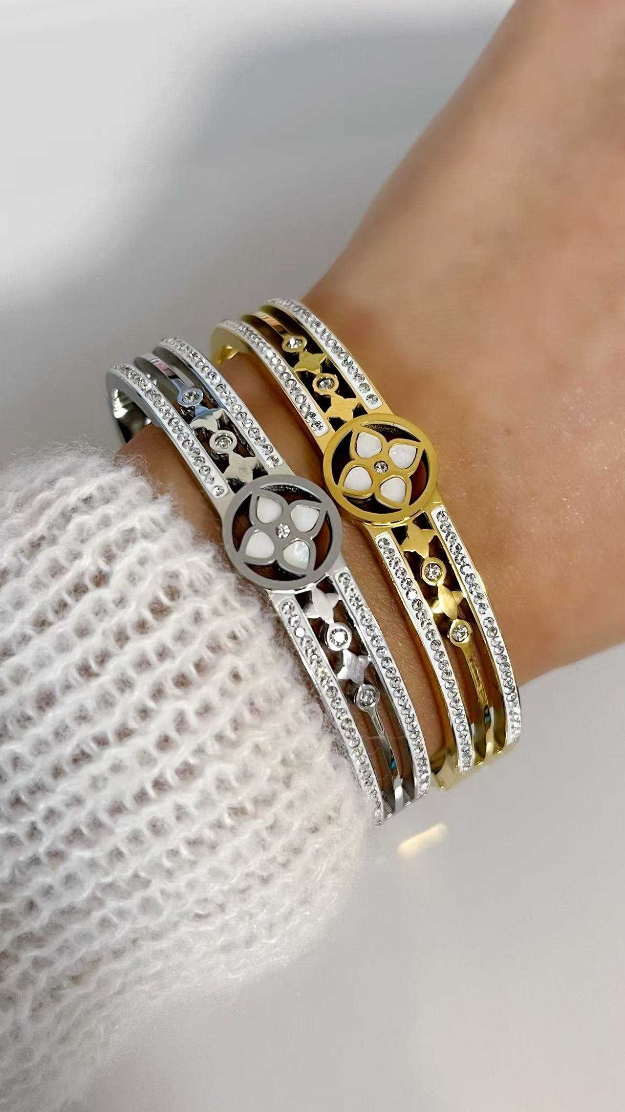 Unlock luck & luxury with HEYBIJOU’s Eternal Clover Luxe Bangle—mother-of-pearl & zircon inlay in gold/silver titanium. Tarnish-free, water-resistant elegance that sparkles forever!