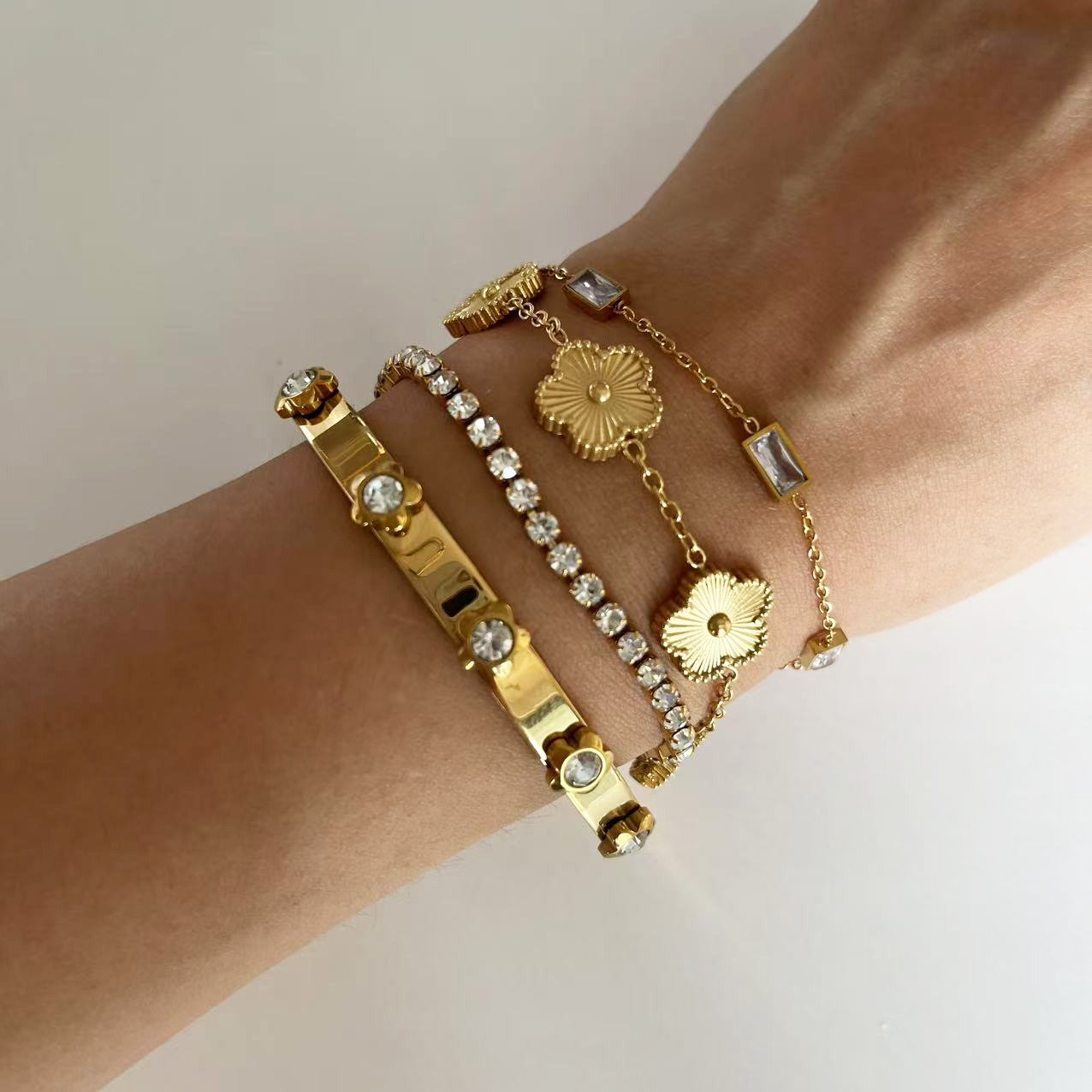 Elegant floral crystal bangle with 18K gold plating. Premium zircon stones on titanium steel. Tarnish-free luxury bracelet for everyday glamour.