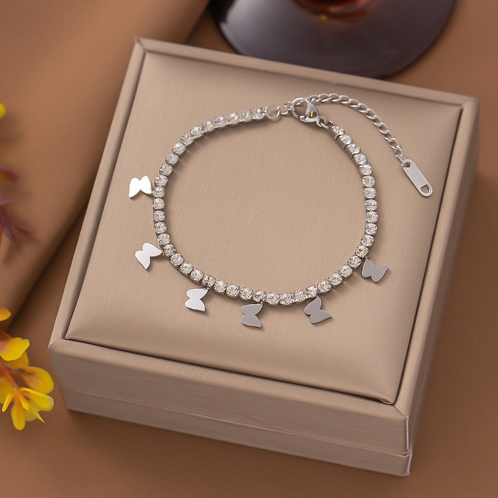 ✨ Enchanting Design: The HEYBIJOU Flutter of Grace bracelet exudes a captivating blend of elegance and whimsy. The delicate titanium steel chain is adorned with a sparkling row of zircon stones, while delicate golden butterfly charms dance along the bracelet, adding a touch of ethereal charm.
