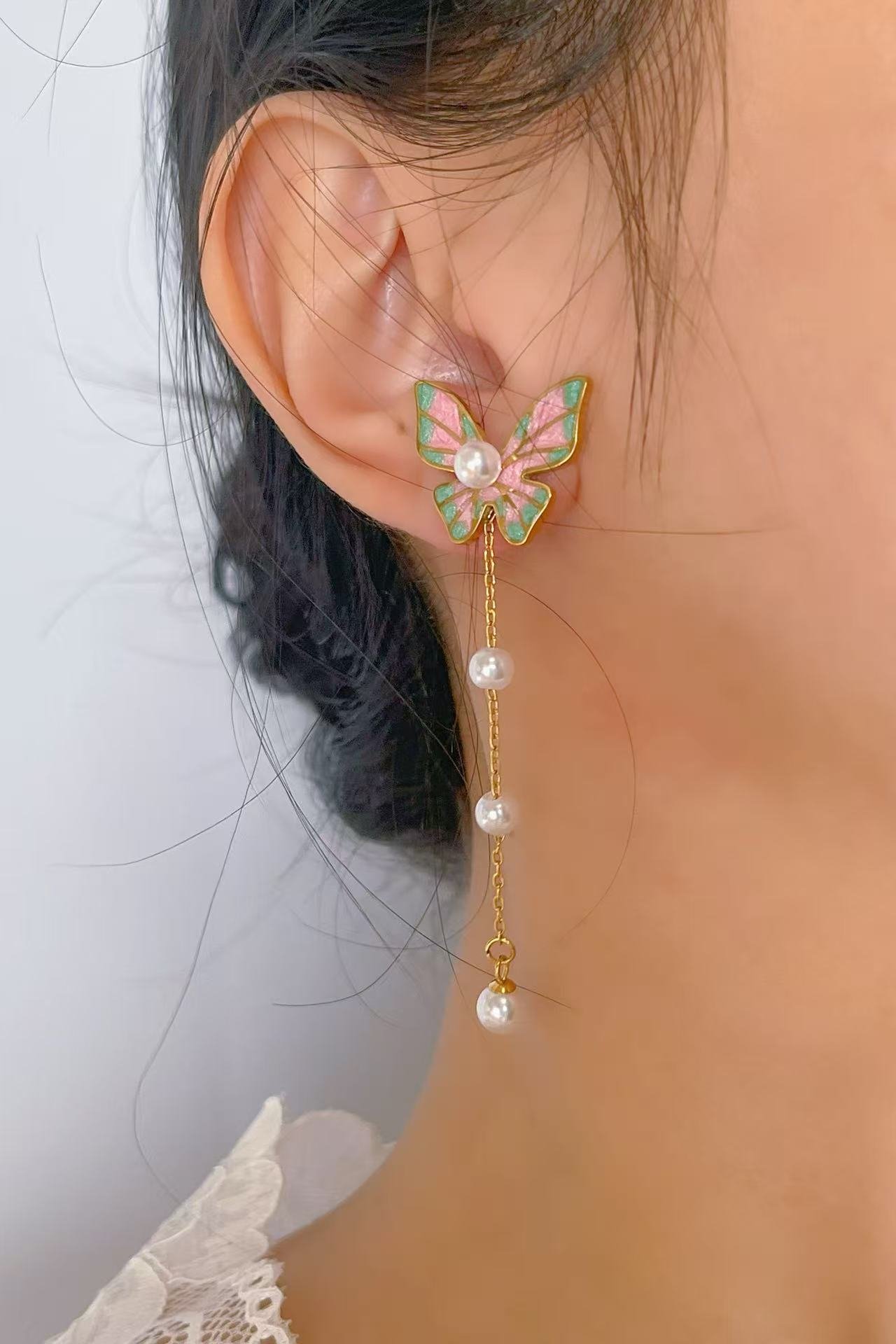 Soar in sorcery: HEYBIJOU Flutterglow Pearl Butterfly Earrings—enamel wings & pearl drops in 18K gold titanium. Tarnish-free, water-resistant whimsy!