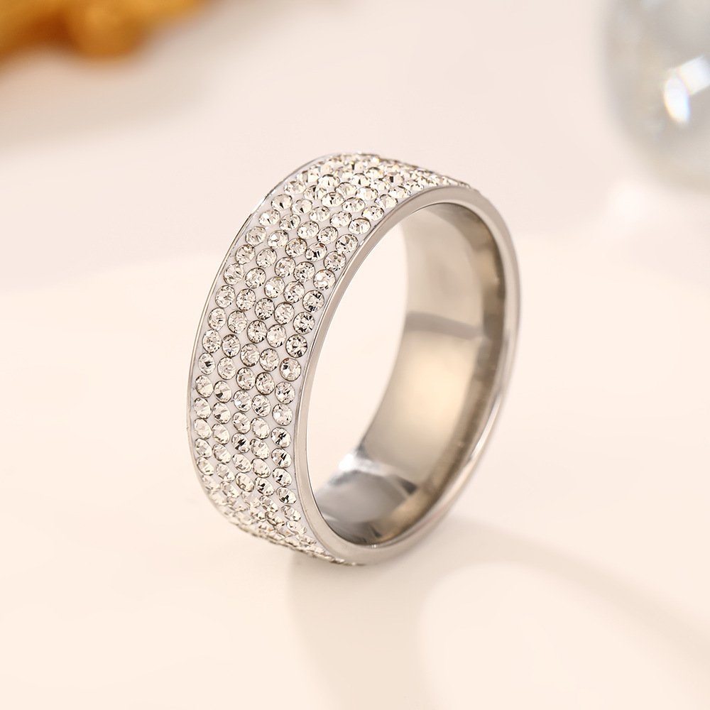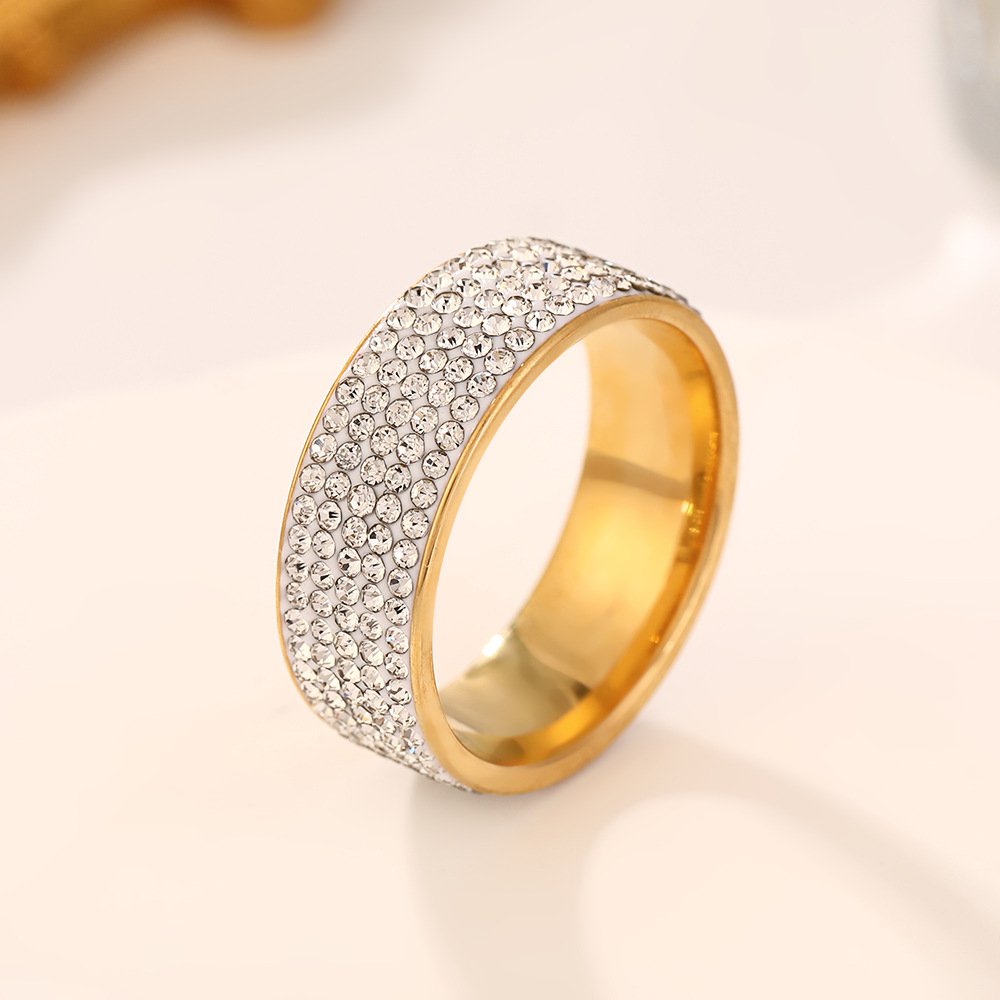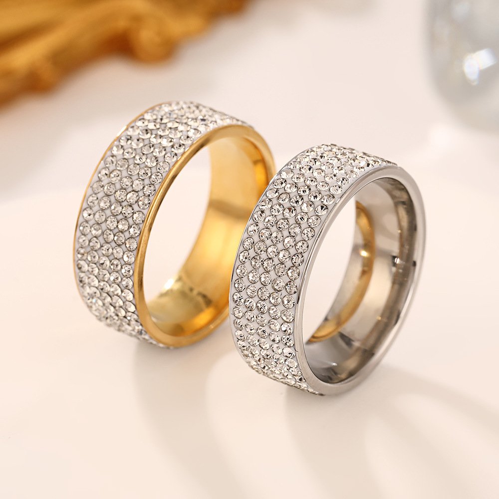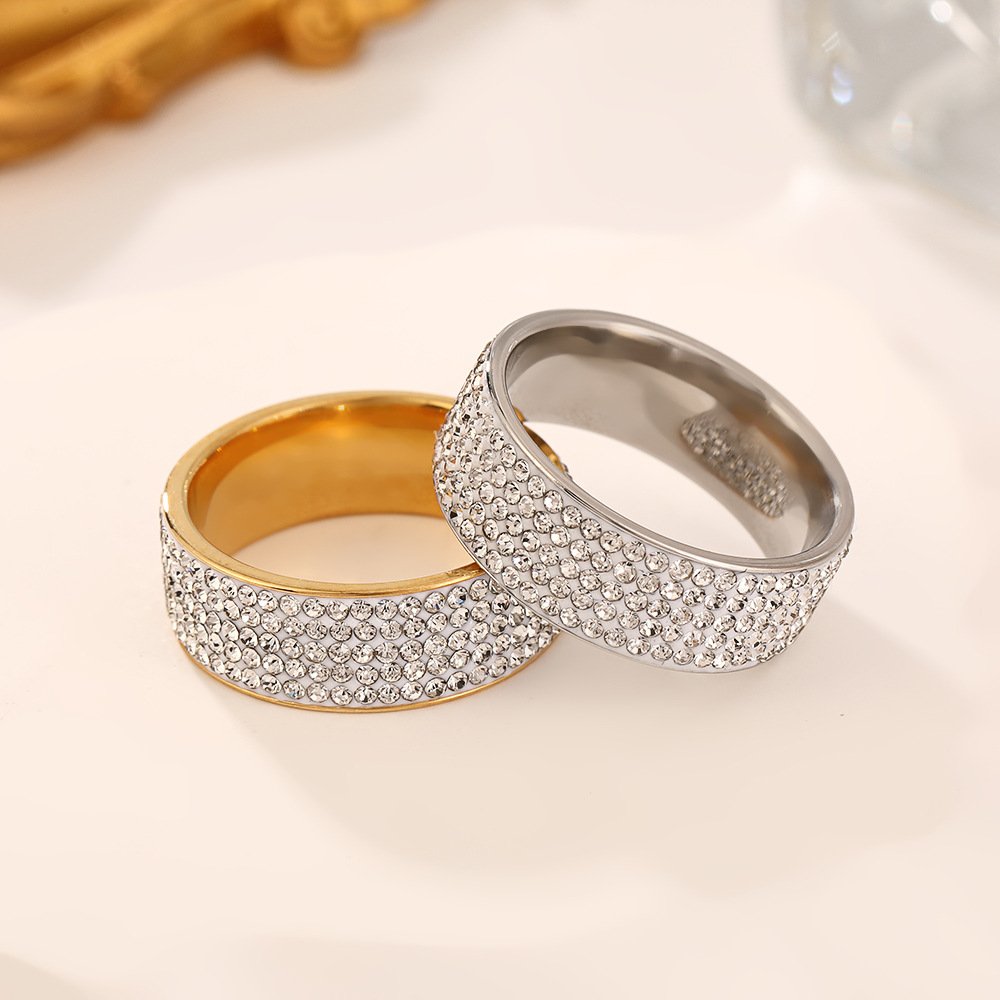 Dazzle fully with our tarnish-free Full Zircon Wide Band Ring (18K gold or silver plating)—titanium steel, complete pavé zircons, sizes #6–#11 for bold luxury shine!