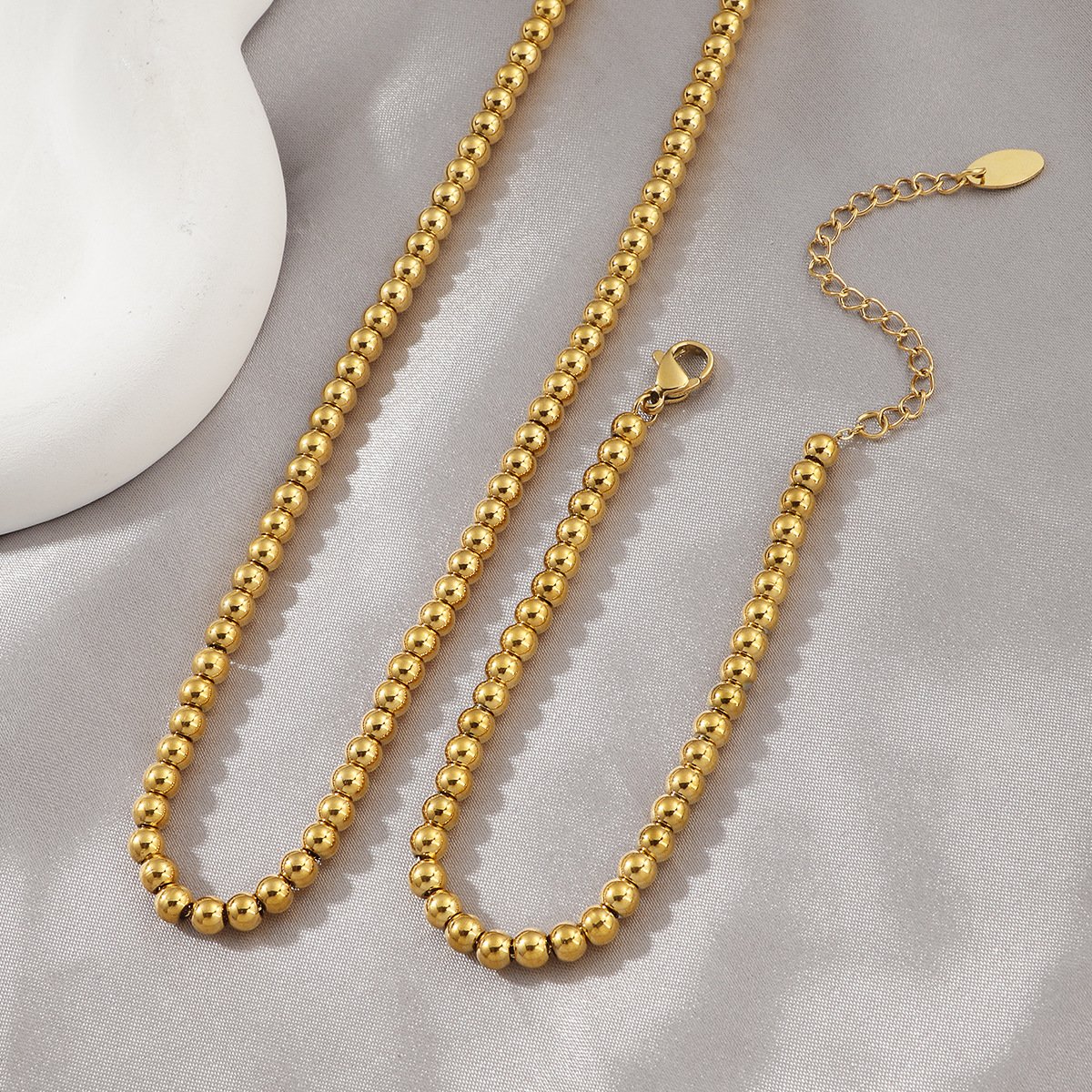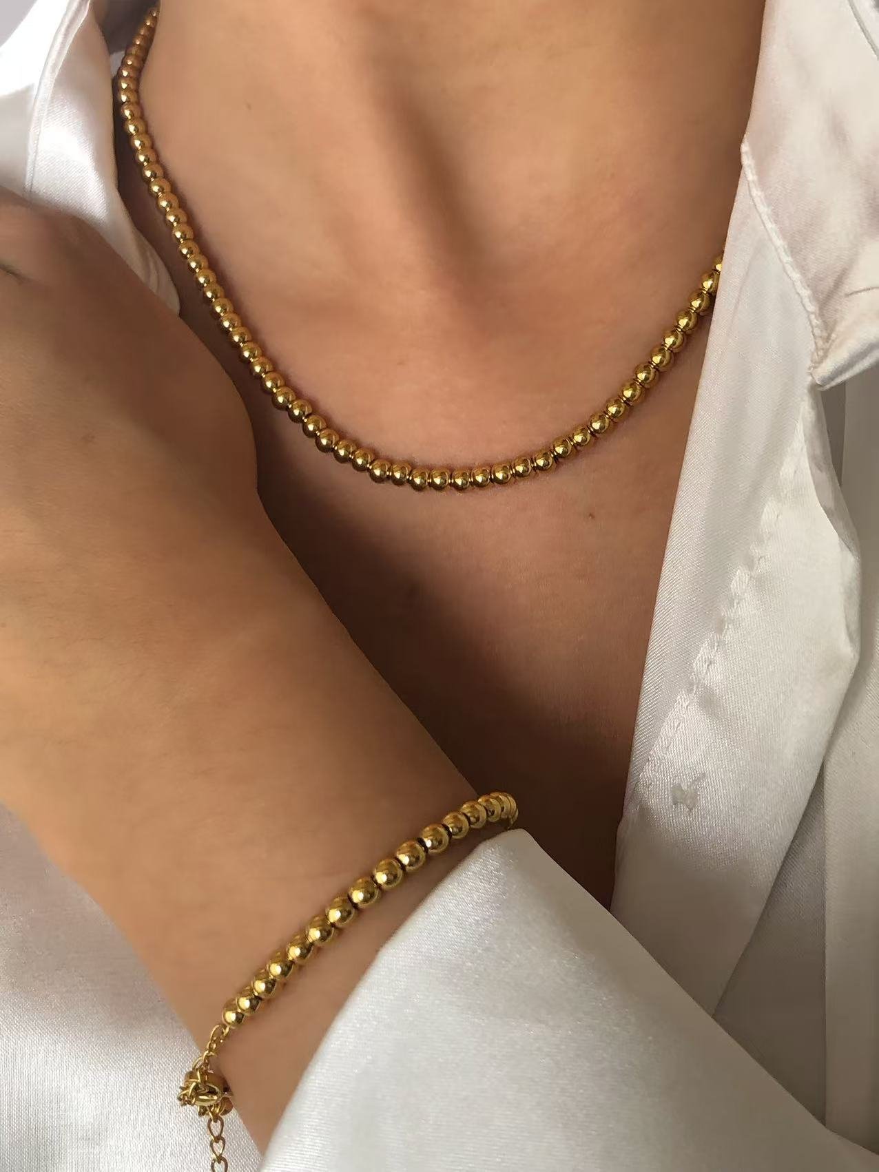 Gold ball bead jewelry set in 18K plating. Matching necklace & bracelet with mirror-finish beads. Tarnish-free titanium steel!