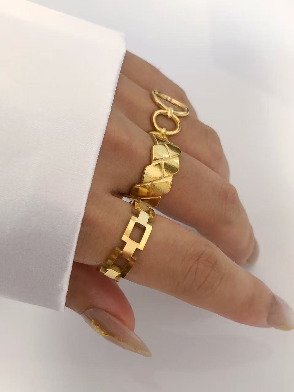 Geometric chain link open ring in 18k gold! Adjustable titanium steel lattice design. Modern architectural jewelry. Shop HEYBIJOU contemporary rings!