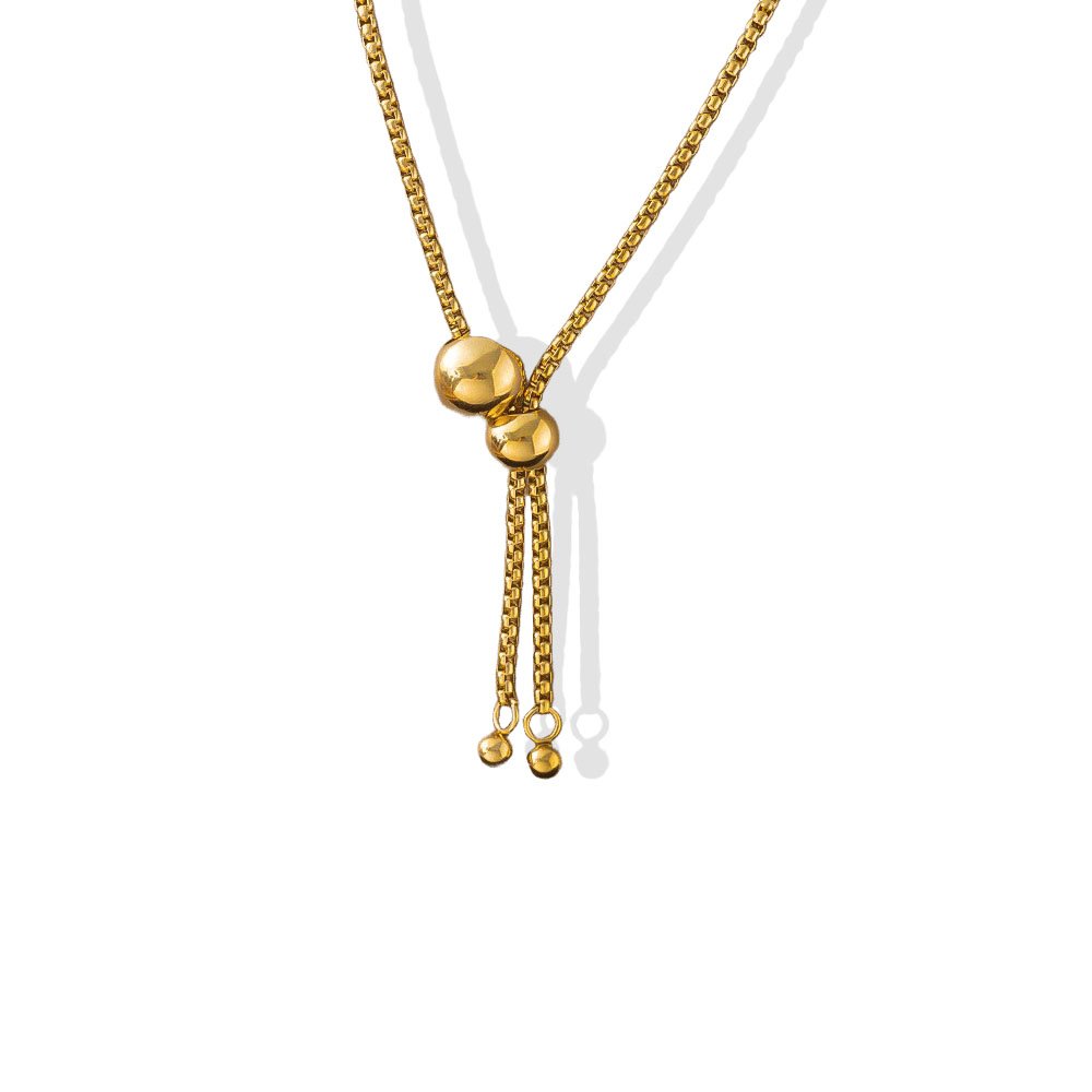 Clean Lines, Pure Luxury Crafted from premium titanium steel with a radiant 18K gold plating, every inch of this necklace radiates a refined, high-polish finish that looks far more expensive than it is. The structured box chain catches light beautifully at every angle, while the dual polished gold spheres serve as both the functional slider and the focal statement — a genius marriage of form and function. The dangling twin chain tails, each tipped with a petite gold ball, sway with effortless movement and add a lariat-inspired drama that elevates any neckline.