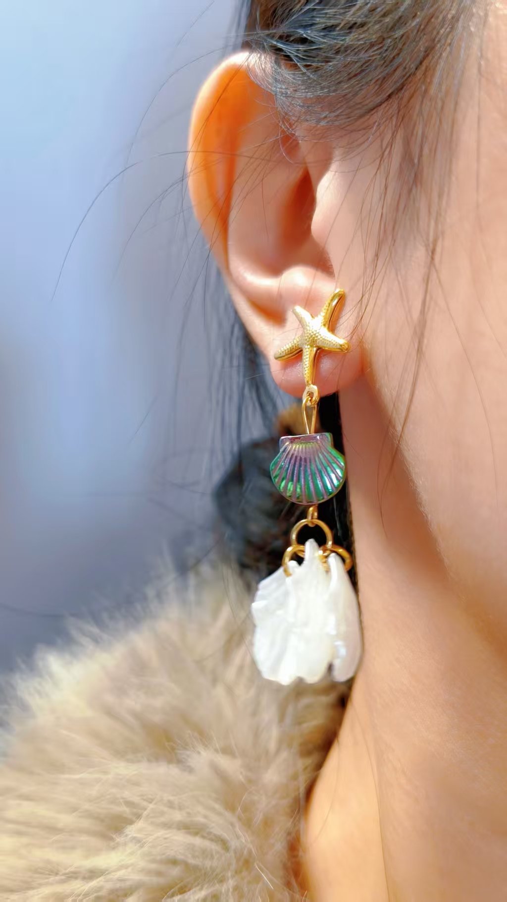 Crafted from 18K gold-plated brass, these earrings boast a radiant finish that captures the sun’s glow. The starfish charm gleams in pure gold tones, while the iridescent shell adds a pop of pastel colors—pink, green, and blue—for an enchanting, premium vibe. The white shell tassels, inspired by blooming sea flora, are lightweight yet durable, ensuring they feel as luxurious as they look without weighing you down.