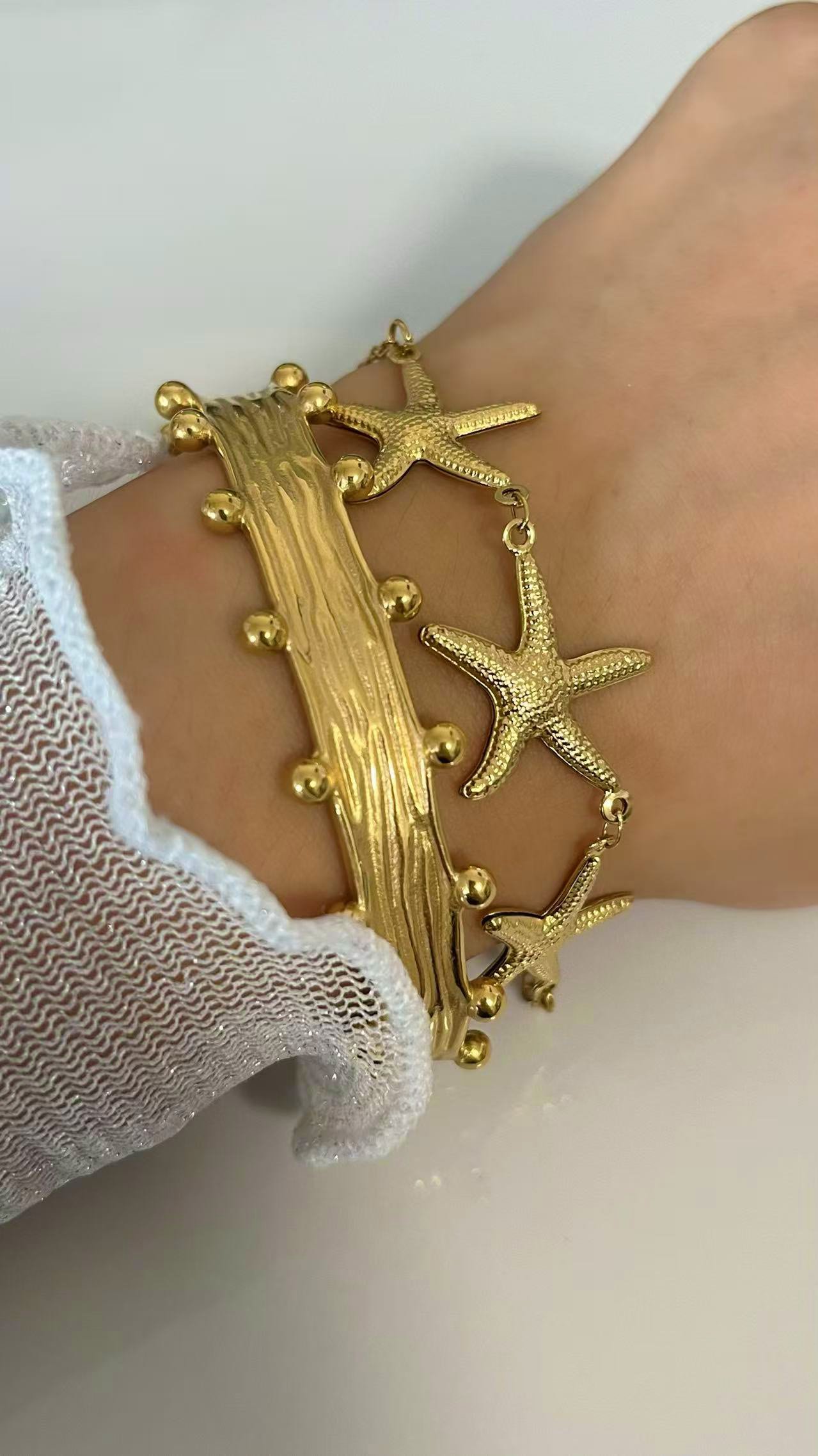 Stunning 18K gold triple starfish chain bracelet – tarnish-free coastal luxury jewelry. Perfect ocean-inspired accessory. Shop HEYBIJOU!
