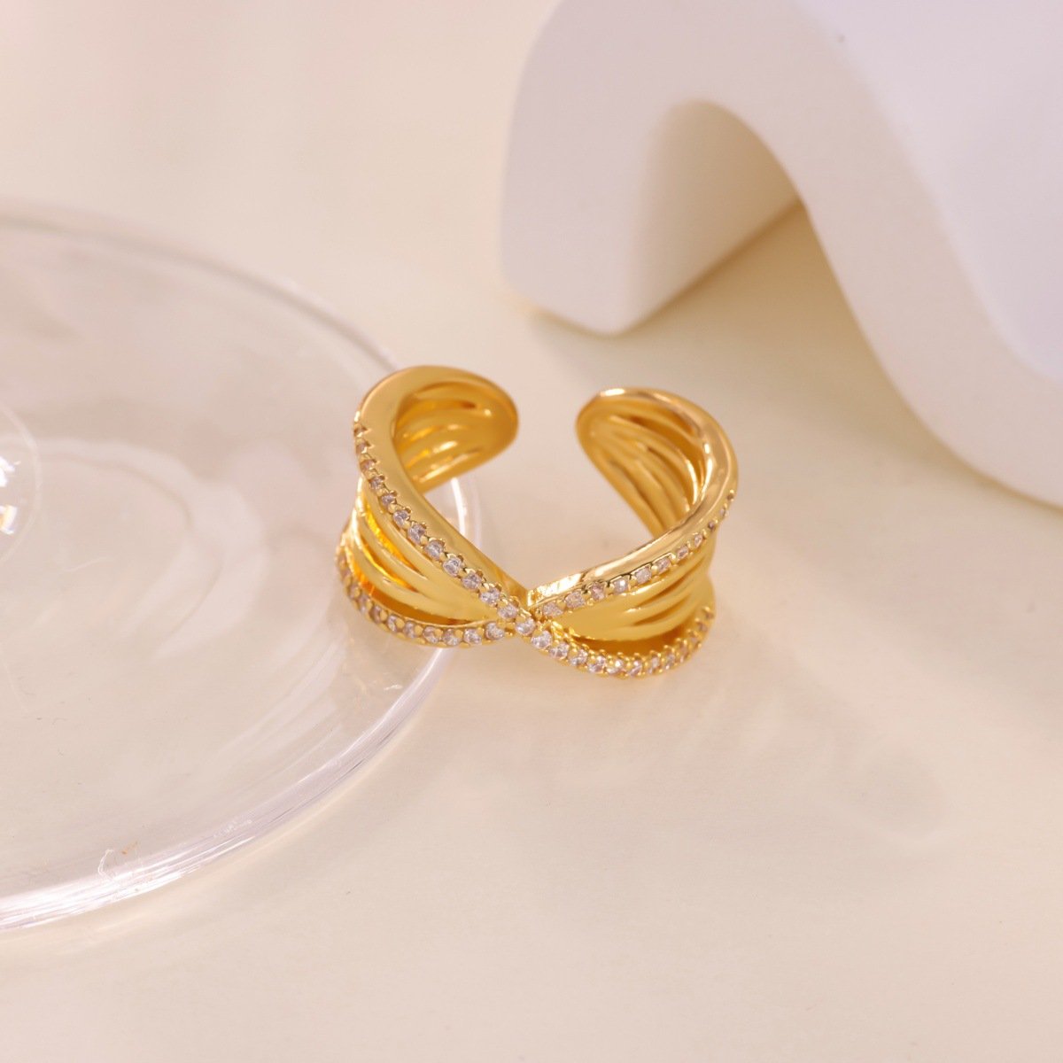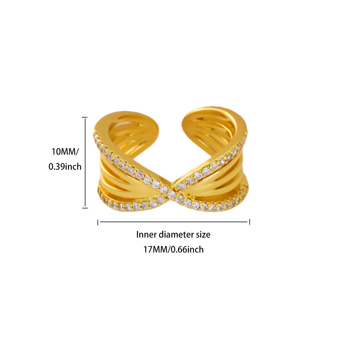 Glow brighter with HEYBIJOU Gold X Zircon Cuff Ring: 18K gold plated titanium steel, crossed design with edge pavé zircons, adjustable open cuff, tarnish-free & water-resistant everyday luxury!