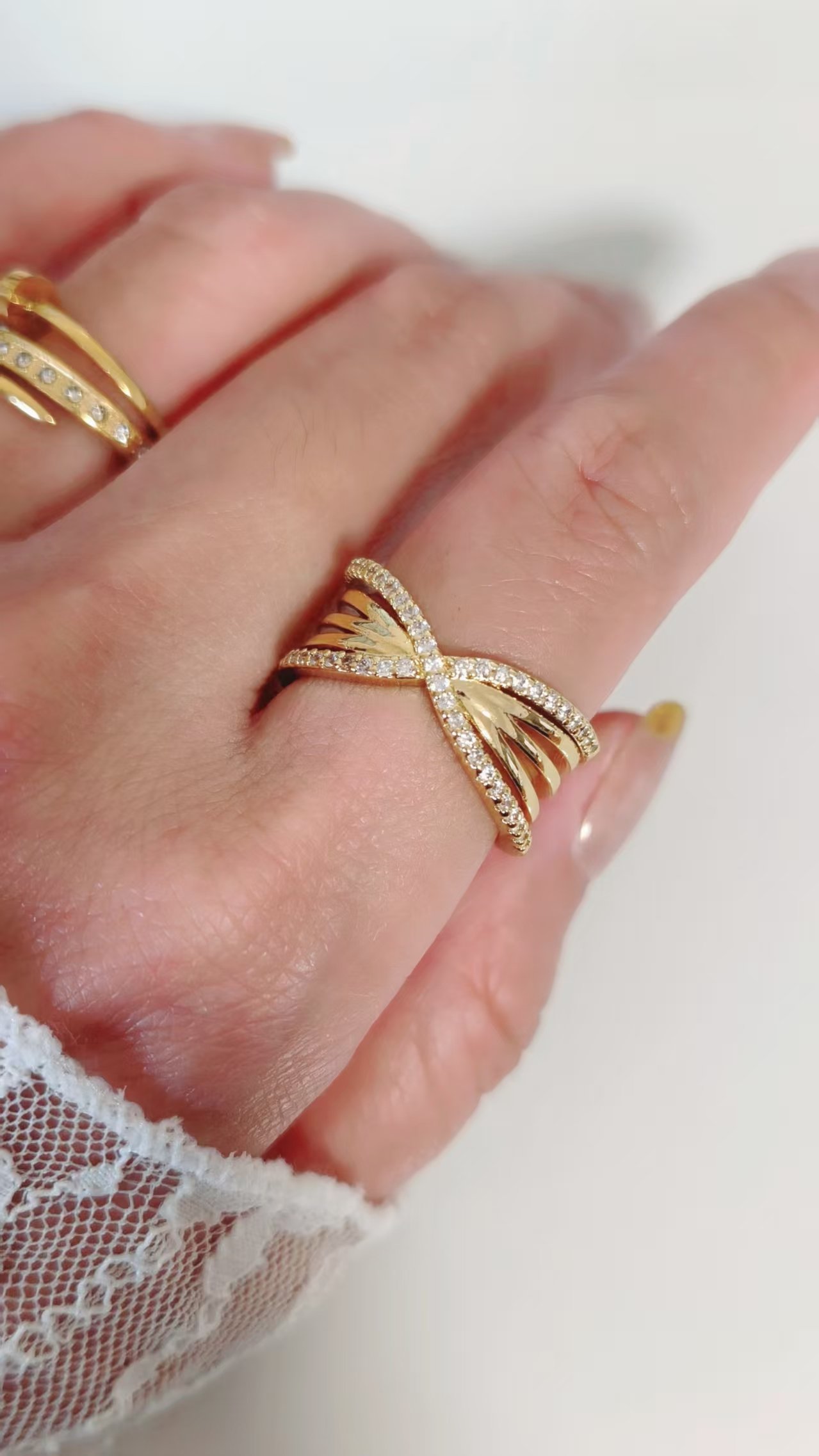 Discover pure sophistication with HEYBIJOU’s Gold X Zircon Cuff Ring – where classic crossed design meets modern sparkle! This stunning open cuff features a graceful double-X (infinity-inspired crossover) silhouette crafted in gleaming 18K gold plating, with each elegant band delicately lined with rows of brilliant cubic zirconia along the edges. The pavé zircon inlays create a continuous ribbon of fire and light that dances with every movement, giving this piece an undeniably luxurious, high-jewelry feel. At once delicate and bold, it’s the perfect balance of understated glamour and eye-catching detail – ideal for making any outfit feel instantly elevated.
