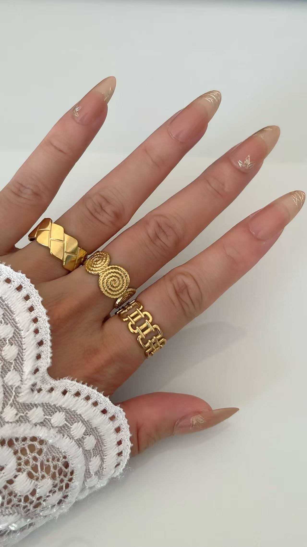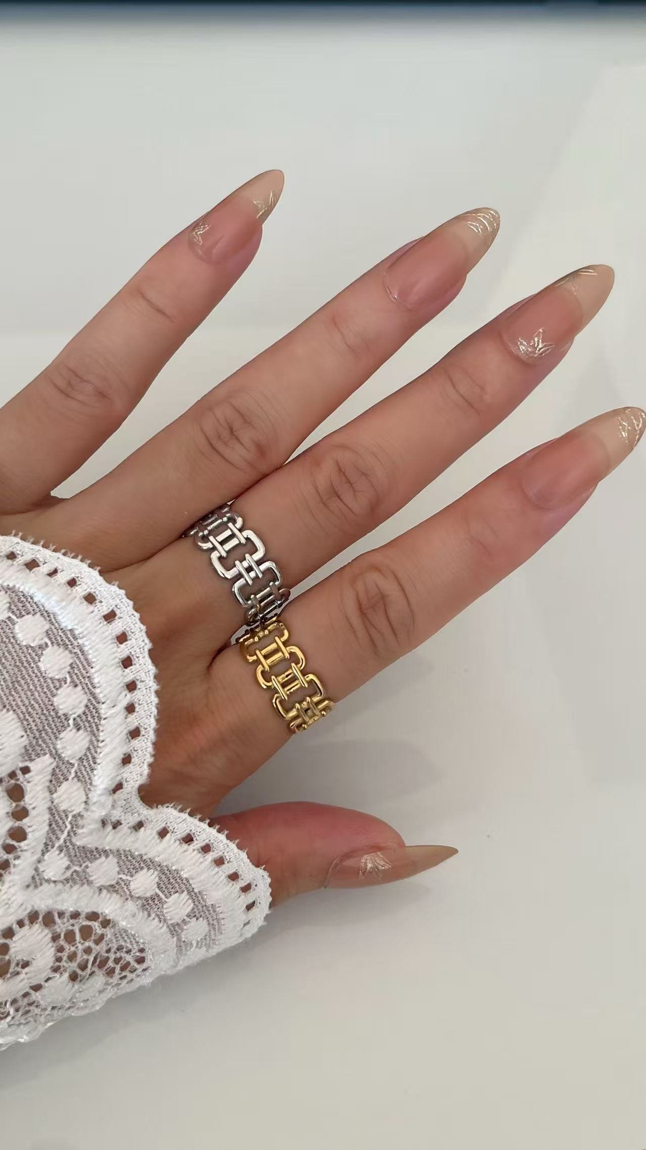 Golden Chain Link Ring – 18k gold/silver plated stainless steel, adjustable open design, tarnish-free & water-resistant. Bold industrial chic jewelry.