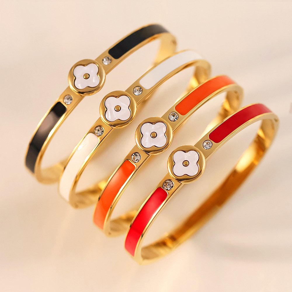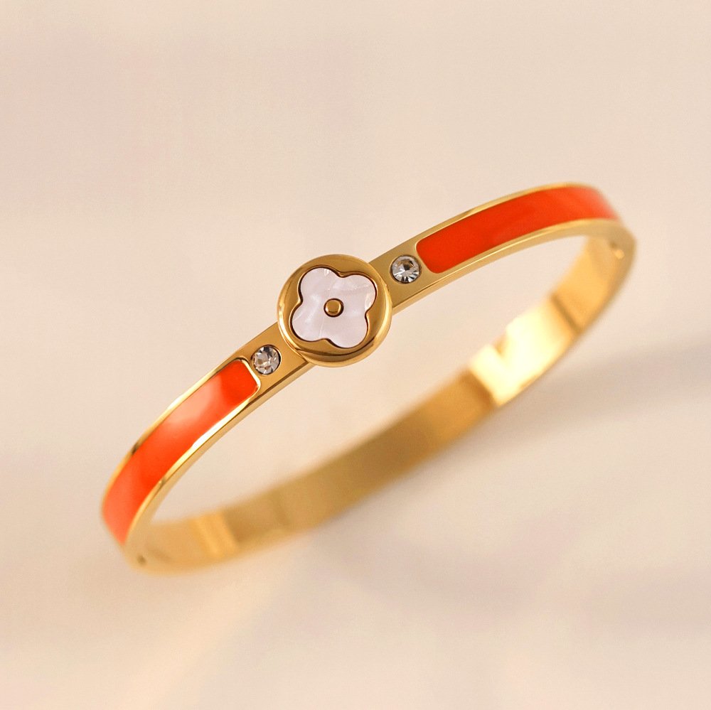 Engineered from resilient titanium steel with rich 18K gold plating, every detail is elevated: the bezel setting protects and highlights the clover motif, while the smooth enamel color inlays deliver jewel-toned intensity that feels couture-level luxurious. The slim, comfortable silhouette glides on easily and stacks beautifully with other bangles or bracelets, offering endless styling versatility. Whether channeling vintage glamour or modern minimalism, this bangle delivers that premium, heirloom-quality feel – because true elegance deserves to be noticed and cherished!