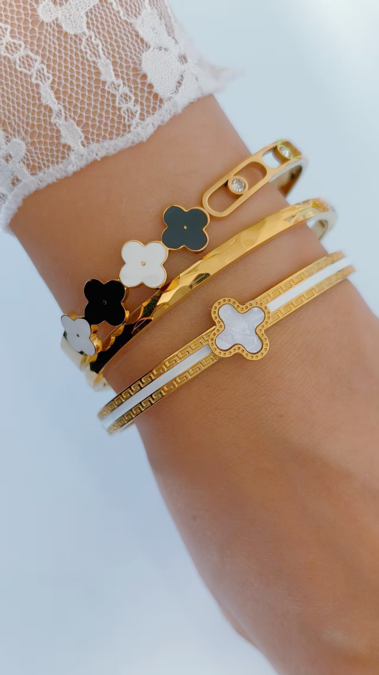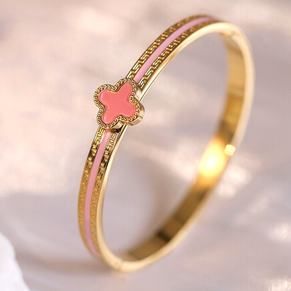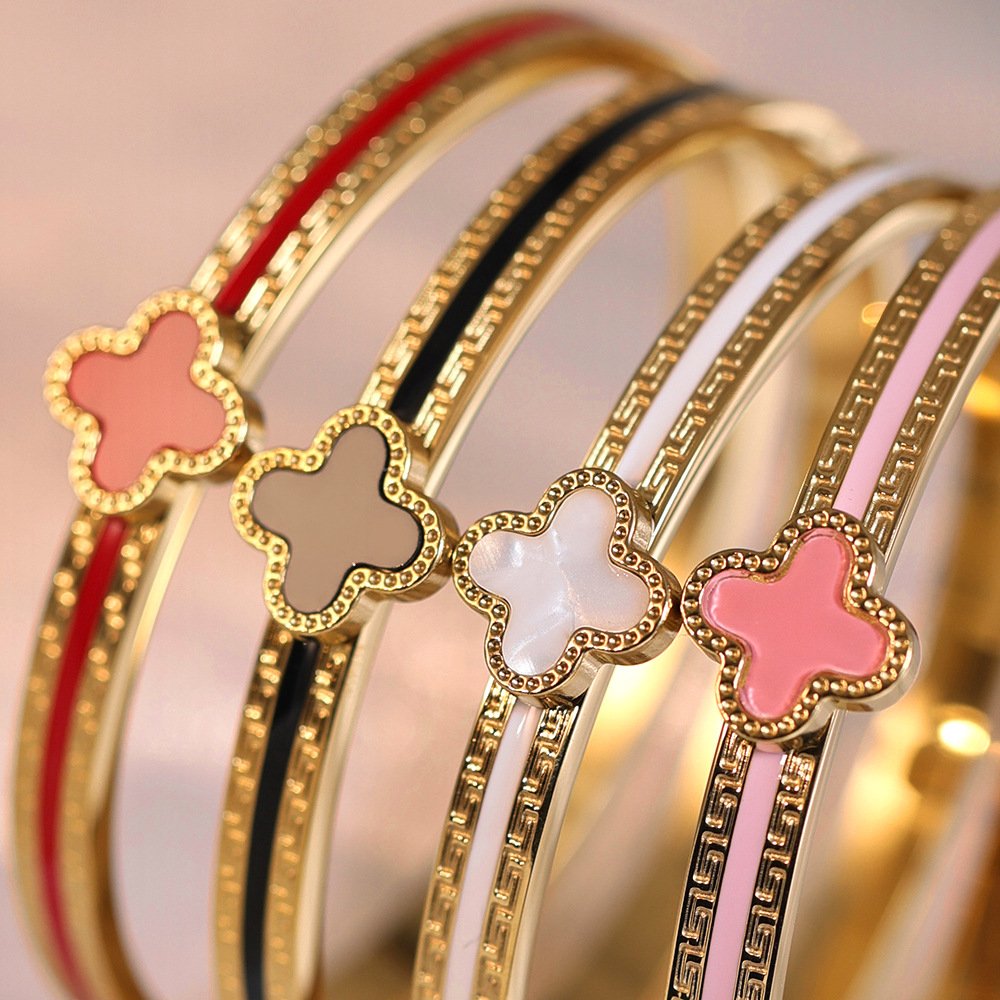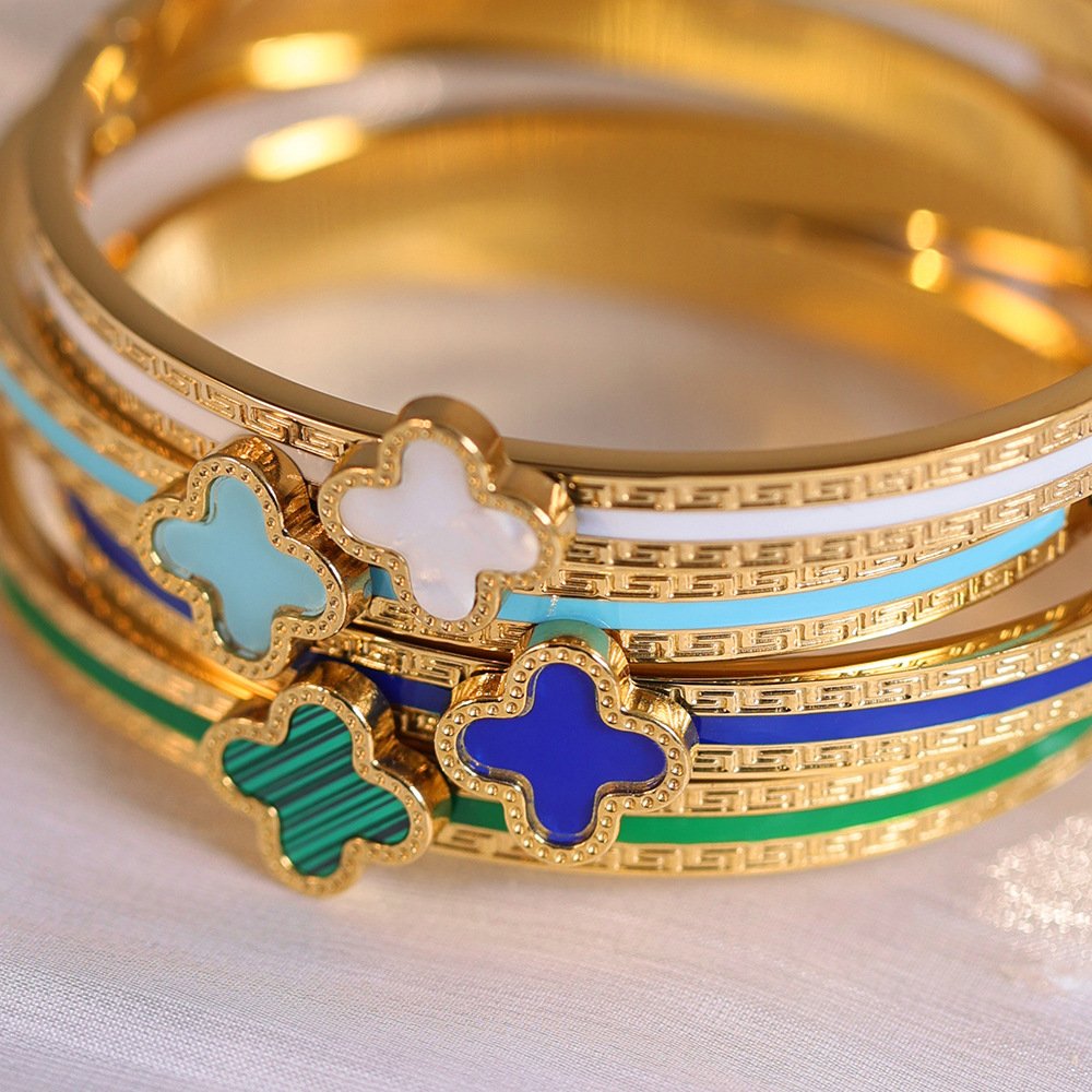 Built on premium titanium steel with luxurious 18K gold plating, the enamel clover delivers rich, jewel-like color that stays vibrant without fading. The detailed Greek key border elevates it to couture status, evoking classic motifs with a modern twist – think heritage luxury meets contemporary chic. Adjustable for a comfortable fit, it’s versatile for layering with other bangles or mixing metals, making it an essential piece for the woman who loves bold statements wrapped in refined artistry. Premium feel, irresistible sparkle, pure joy on your wrist!