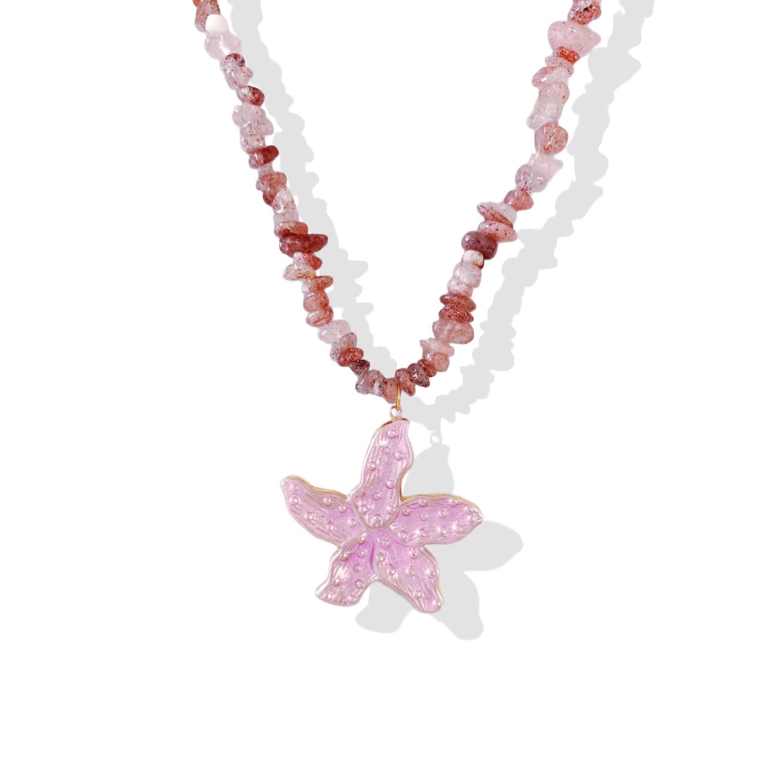 Glow with beach magic in our tarnish-free Golden Enamel Pink Starfish Sunstone Necklace—18K gold-plated titanium, vibrant starfish pendant & shimmering natural stones!