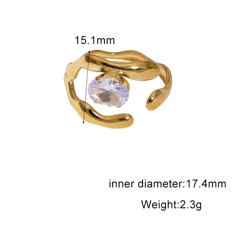 Dazzle with modern edge in our tarnish-free Golden Fluid Organic Zircon Open Ring—18K gold-plated titanium, sculptural design & brilliant oval zircon luxury!