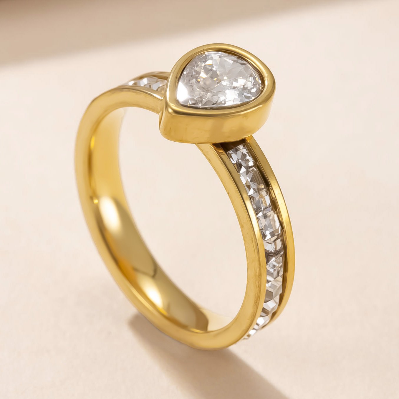 No tarnish, no dulling – this ring is completely tarnish-free and water-resistant, built to keep its golden halo shining and every zircon dazzling through hand-washing, beach days, workouts, showers, or spontaneous adventures. The resilient titanium core and protective plating preserve the bezel security and full pavé brilliance, ensuring your pear-drop treasure stays flawless, lightweight, and as eye-catching as the day you slipped it on. True premium jewelry designed for the woman who shines non-stop!