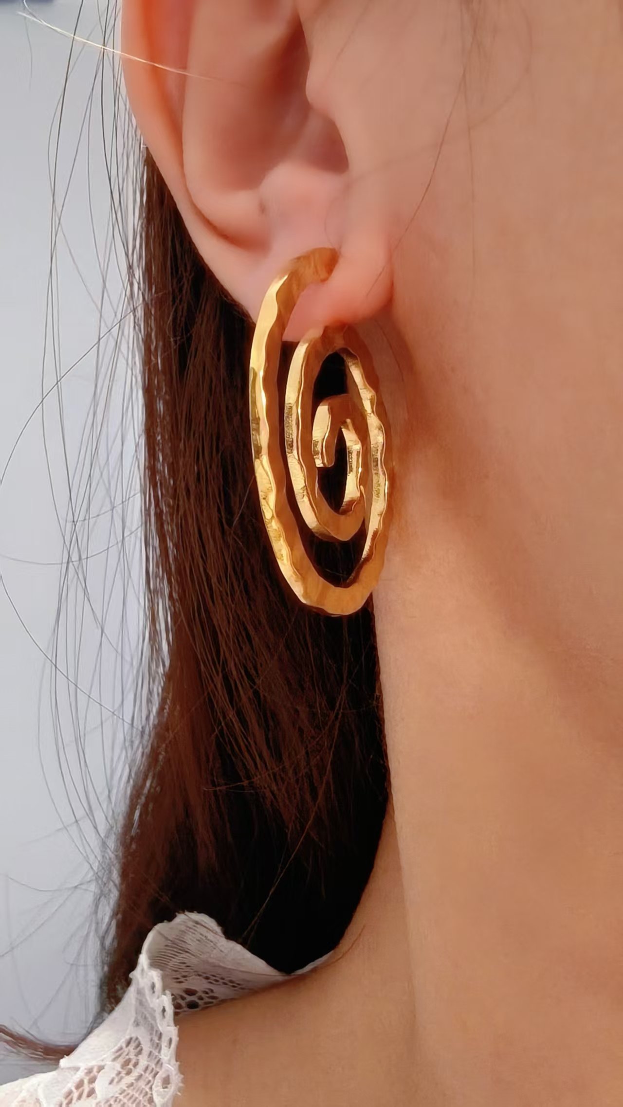 Built on ultra-durable titanium steel and drenched in opulent 18K gold plating, these earrings glow with that warm, heirloom-quality golden finish that never tarnishes. The spiral shape boasts fine, hand-hammered marks for authentic tactile interest and subtle shadows, creating a high-end, gallery-worthy effect that sets them apart from ordinary hoops. Secure posts ensure all-day comfort, and the dramatic scale makes them ideal for statement styling – pair with sleek updos for evening drama, flowy dresses for boho romance, or minimalist outfits for quiet rebellion.
