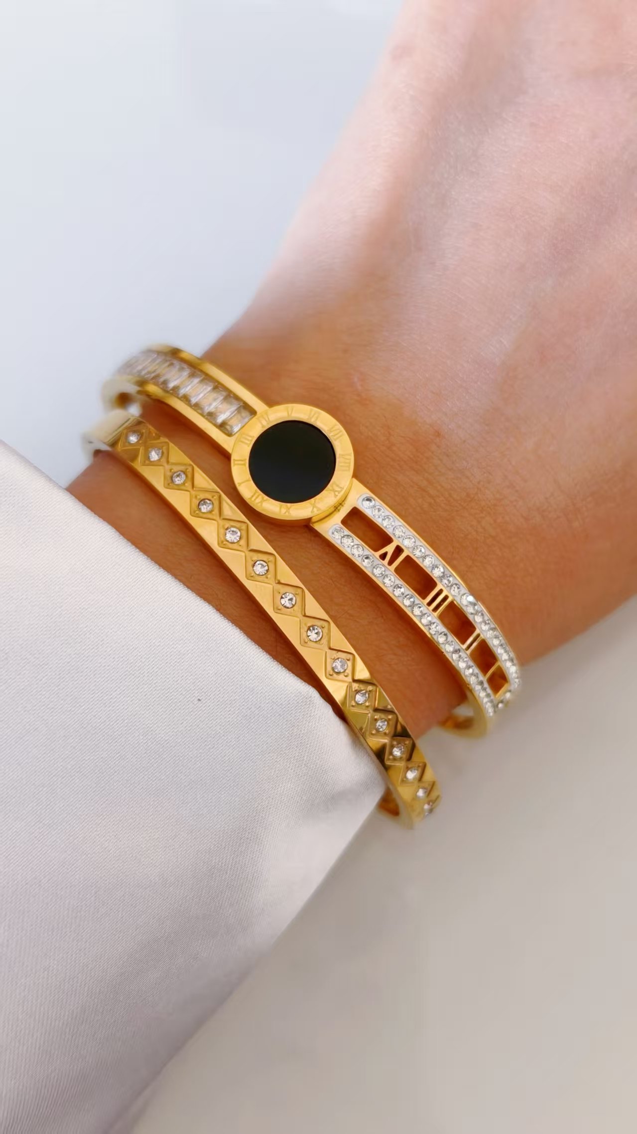 Timeless luxury in our tarnish-free Golden Roman Numeral Zircon Bangle—18K gold-plated titanium, black onyx center + full pavé zircon bands for elegant sophistication!