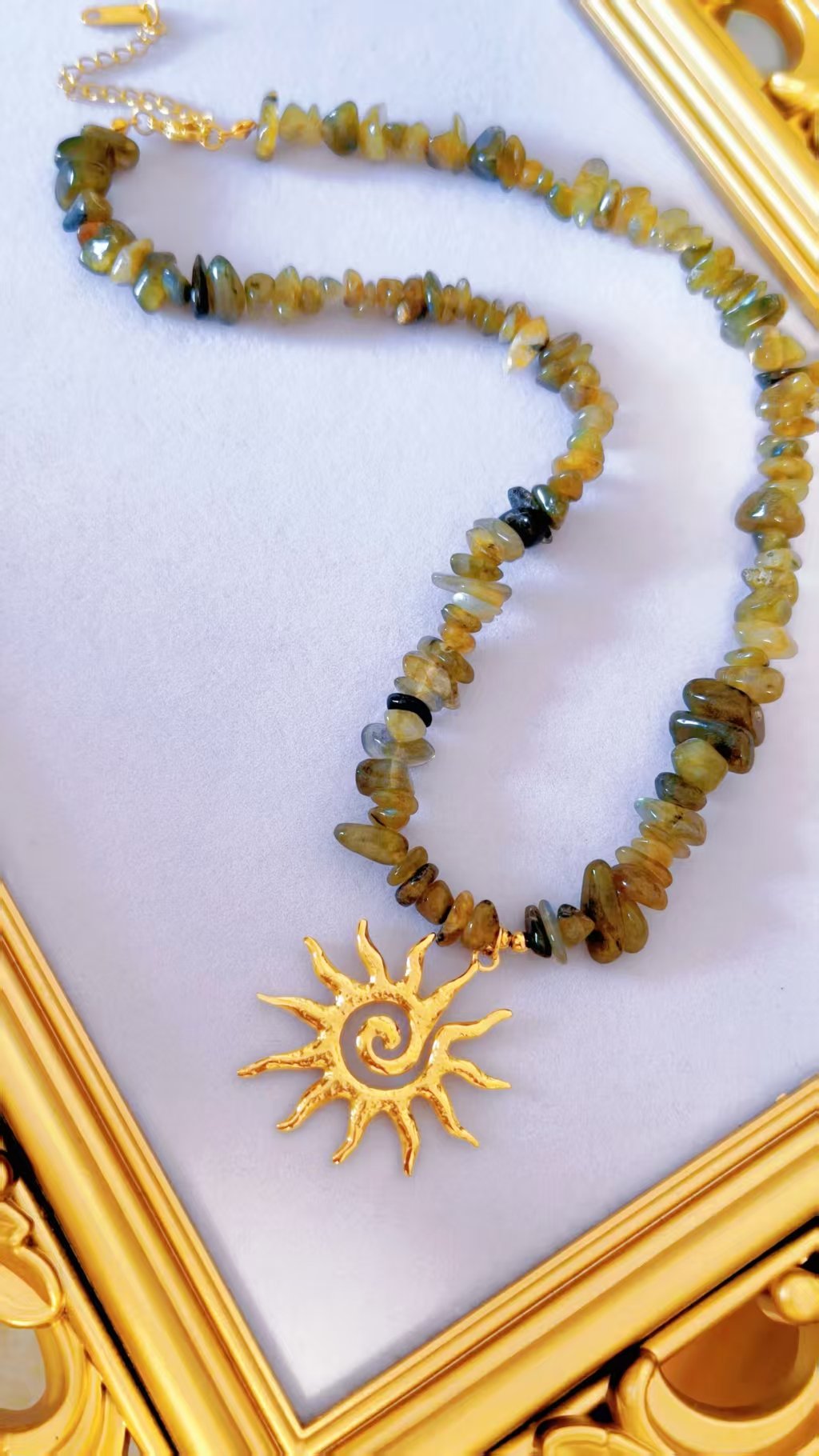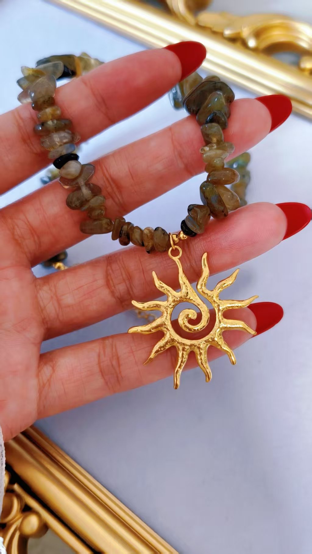 Crafted on a sturdy titanium steel base with luxurious 18K gold plating, every link and pendant shines with that premium, heirloom-quality luster. The genuine natural stone beads bring organic texture and one-of-a-kind variations, while the oversized sun pendant commands attention with its artistic, boho-luxe vibe. Lightweight yet substantial, it drapes elegantly against the skin, offering effortless comfort and a statement presence that elevates casual looks to goddess-level glamour in seconds.