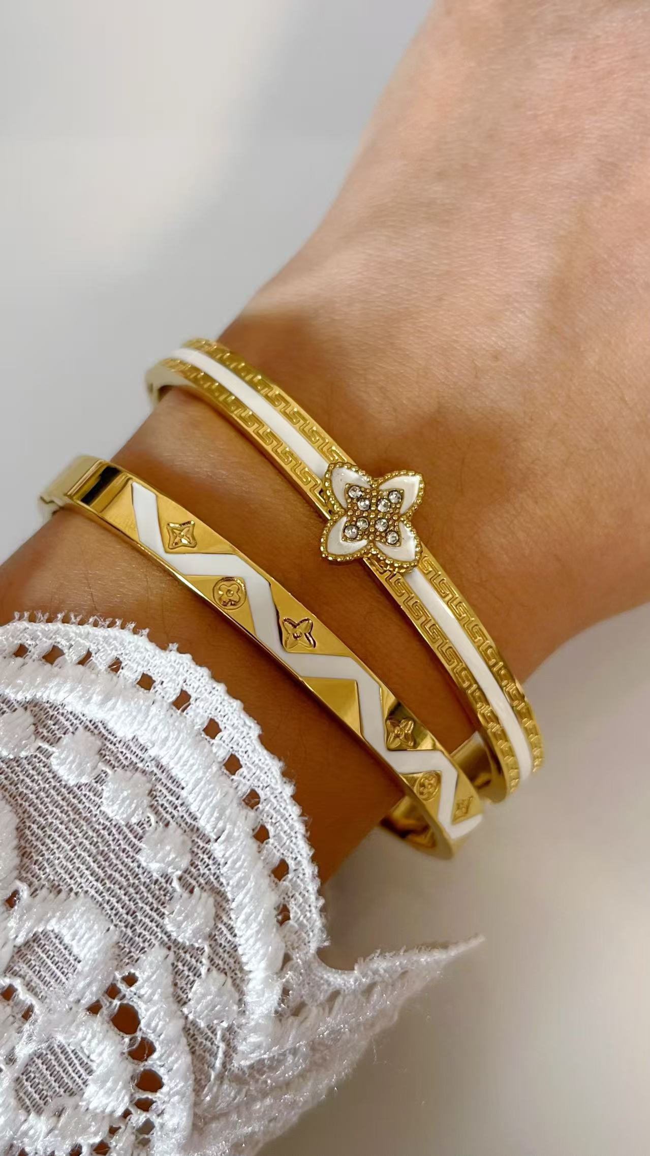 Timeless Greek key meets sparkling clover in HEYBIJOU’s elegant enamel gold bangle – tarnish-free, waterproof heirloom glow!