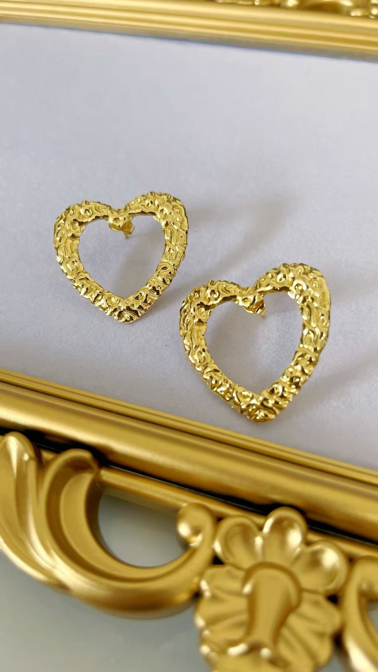 HEYBIJOU’s Hammered Heartfire Studs: 18K gold-plated textured hearts that pulse with passion. Tarnish-free, water-resistant—bold romance for your untamed glow. Ignite now!