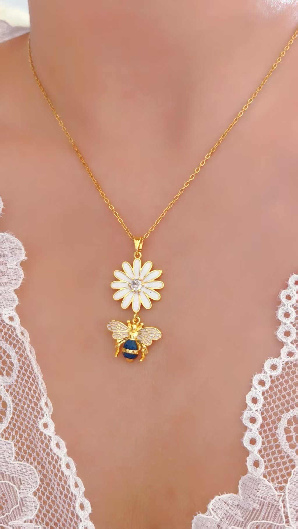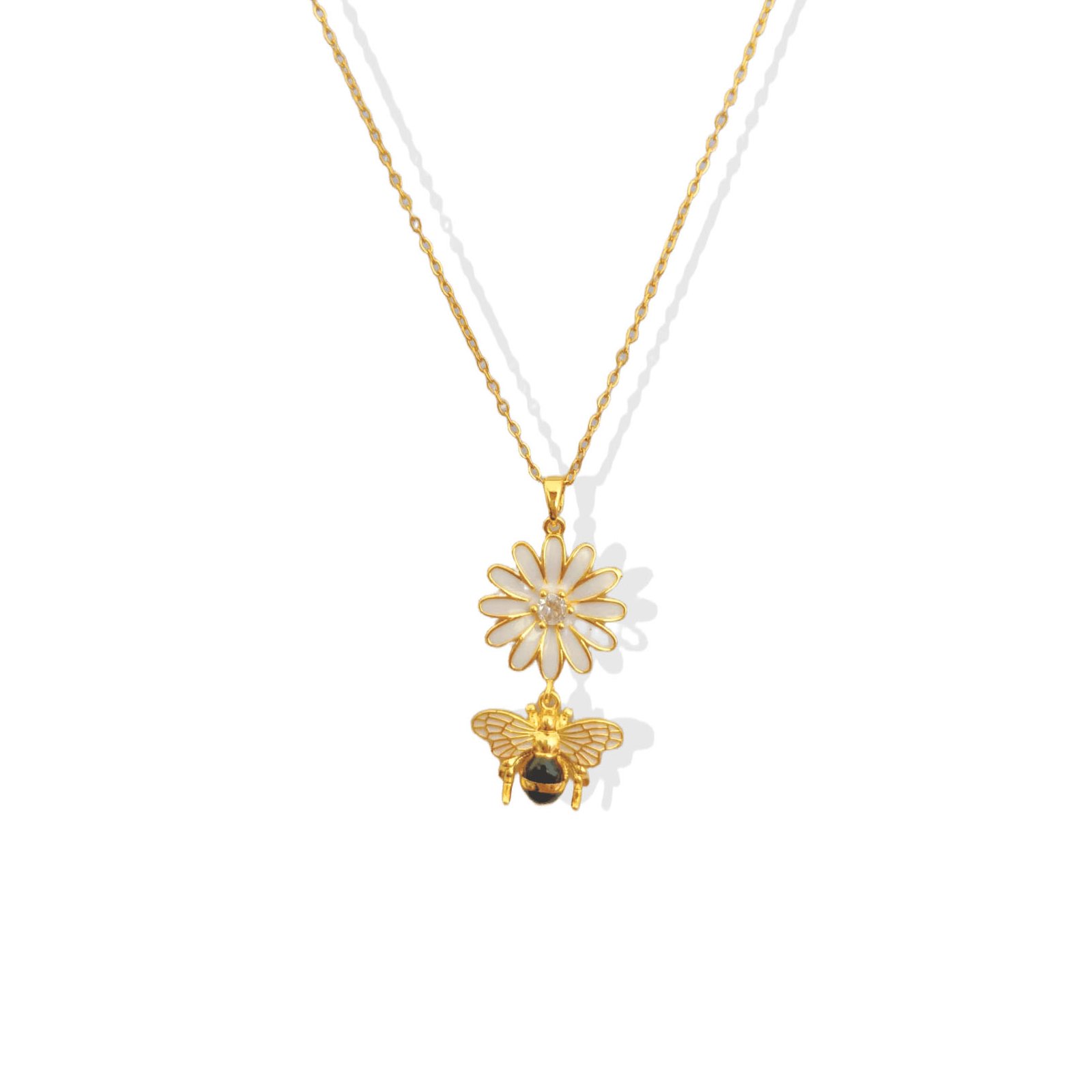 Gold daisy & bee pendant necklace with white enamel & zircon β tarnish-free, water-resistant & utterly enchanting. Wear the garden. πΌπβ¨