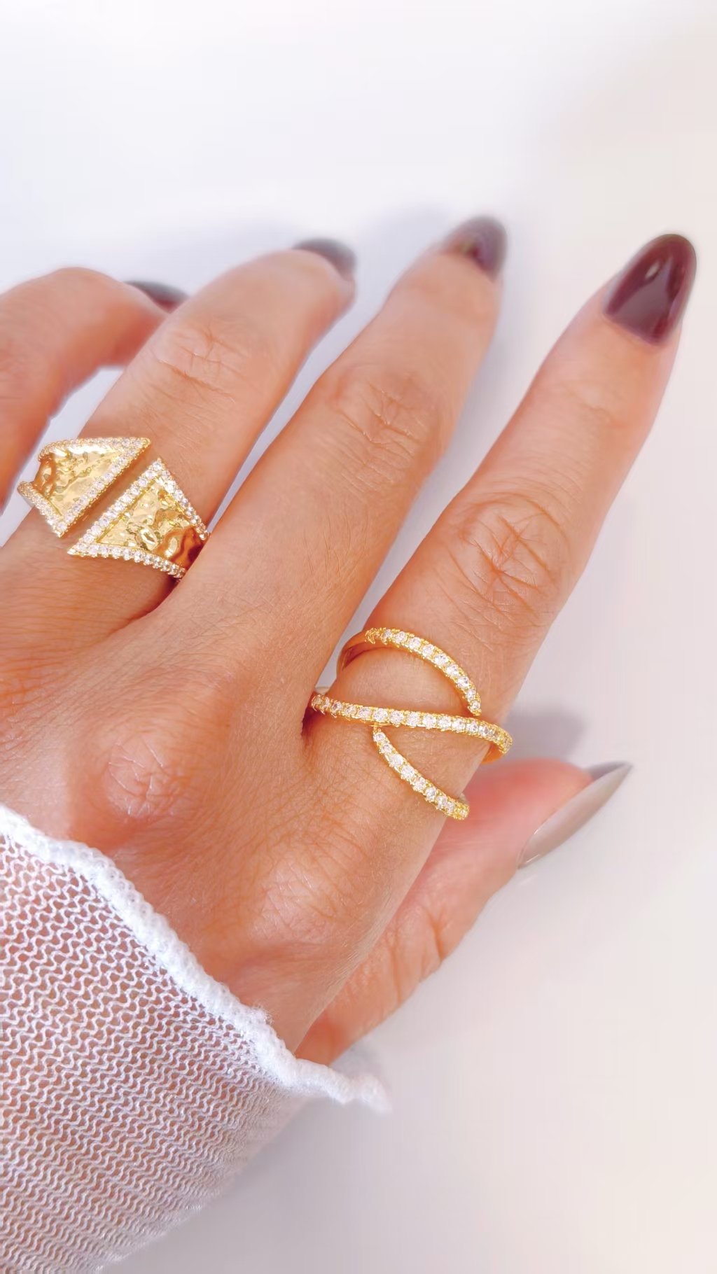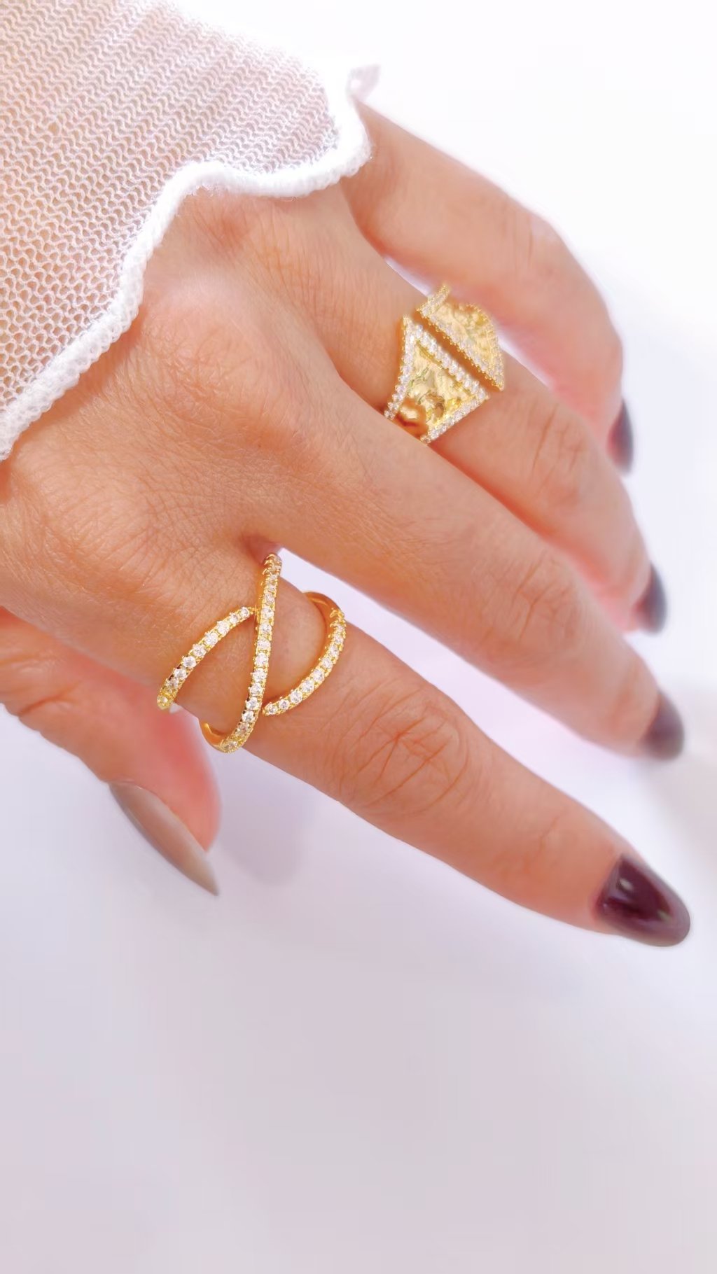 💎 The Beauty of the Curve This ring is all about movement. Three continuous pavé zircon lines sweep and cross each other in a graceful, looping formation — one arching over the top, one cutting diagonally through the center, one sweeping beneath — together creating a layered, interwoven silhouette that appears to shift and change with every angle. Every single millimeter of each line is set with sparkling round zircon stones, so the brilliance is truly uninterrupted — a seamless river of light that wraps your finger in pure, glittering elegance. The open negative spaces between the crossing bands add lightness and a sculptural quality that makes this ring feel like fine art you can wear.