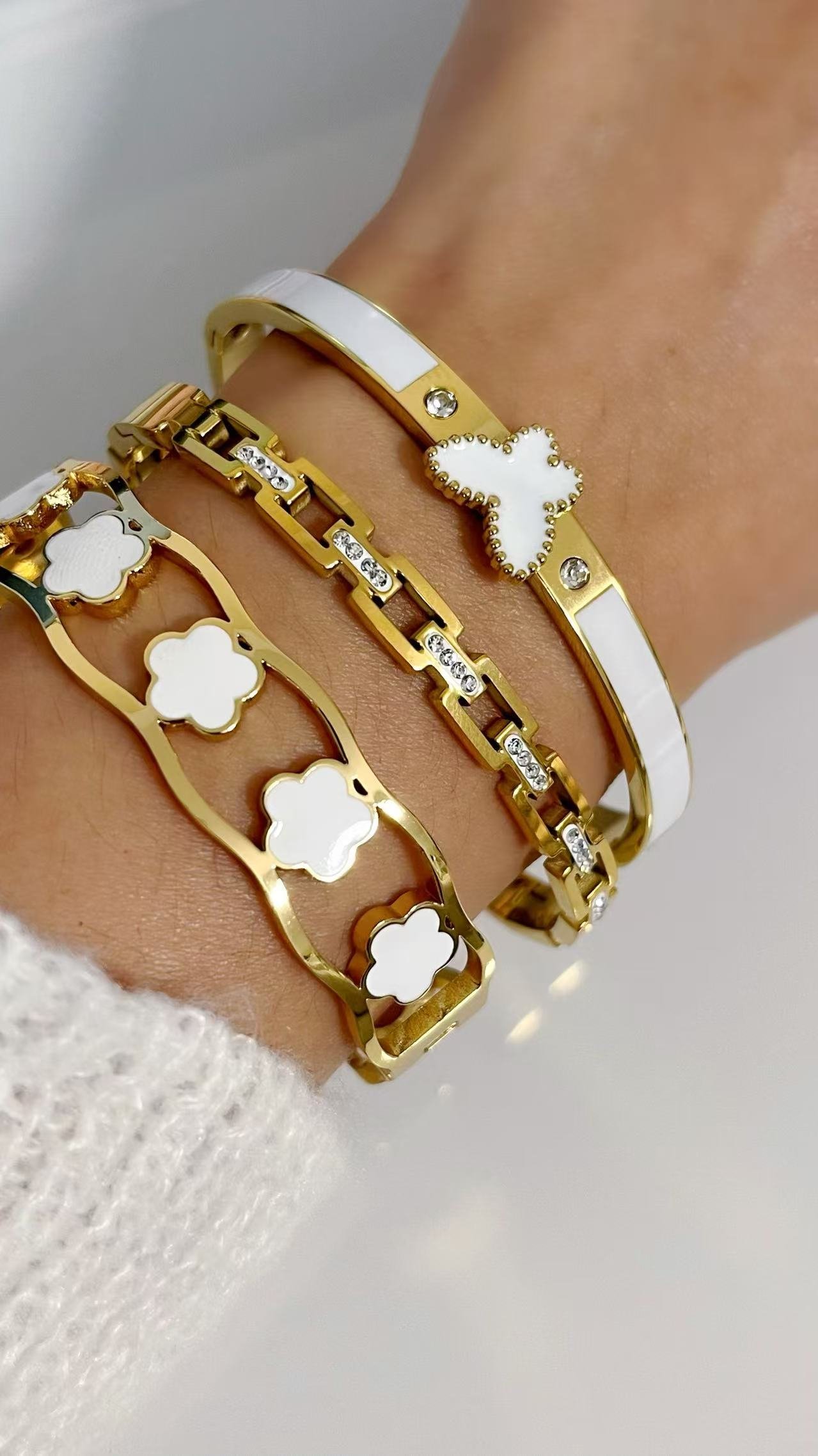 Elegant 18K gold plated titanium steel bangle with white enamel and butterfly detail, accented with zircon. Hypoallergenic, durable, and luxuriously feminine.