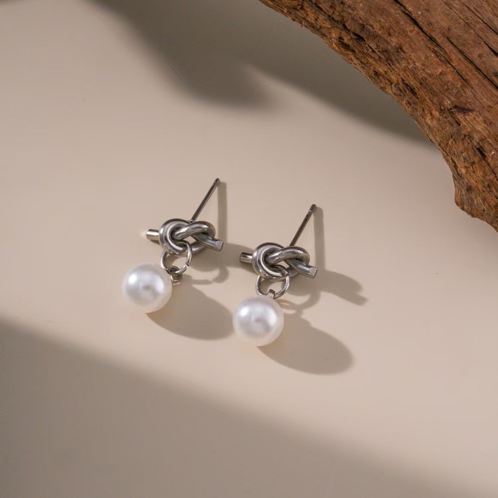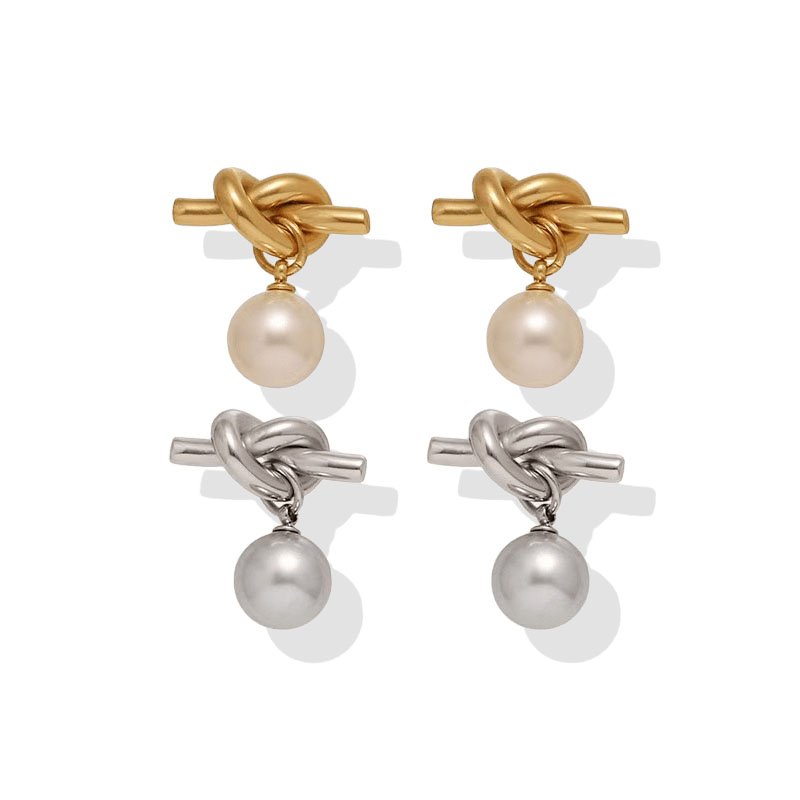 HEYBIJOU knotted pearl drop stud earrings—elegant metal knot with dangling pearl in 18K gold or silver plated titanium steel. Tarnish-free, water-resistant luxury!