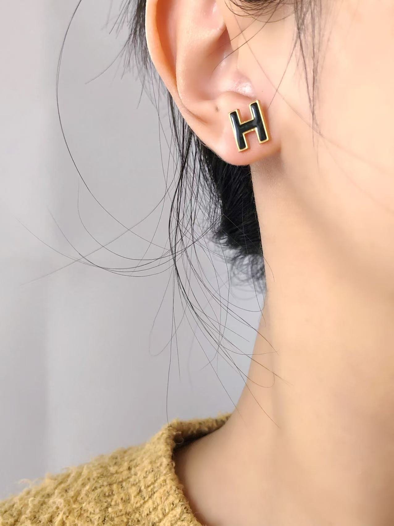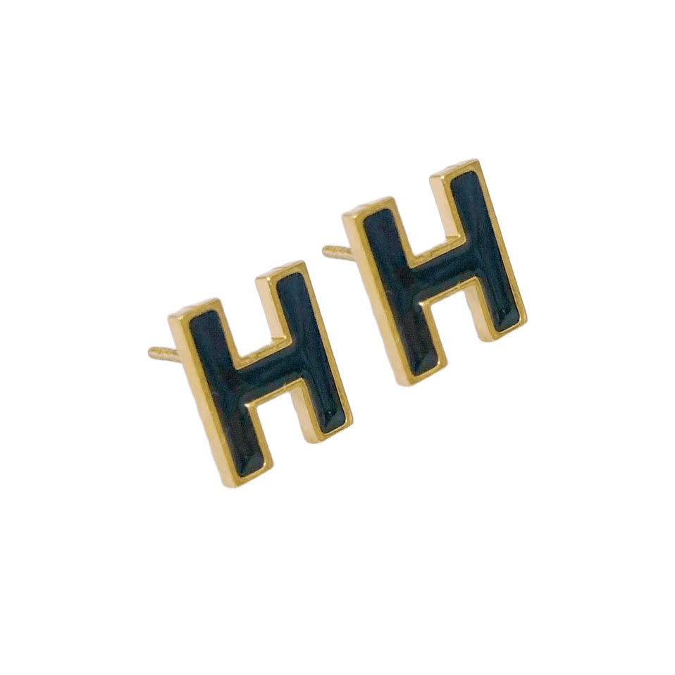 Letter H stud earrings with black enamel in 18k gold. Personalized initial design, tarnish-free. Monogram name jewelry. Shop HEYBIJOU now!