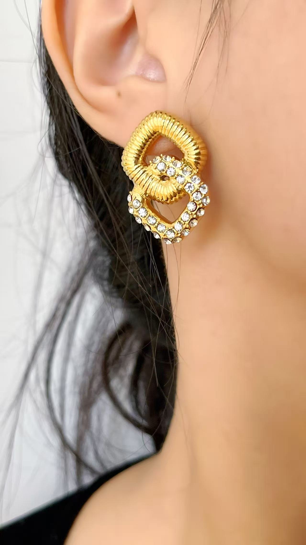Elegant 18K gold plated knot earrings crafted in stainless steel with sparkling zircon inlay. Hypoallergenic, durable, and full of modern glamour.