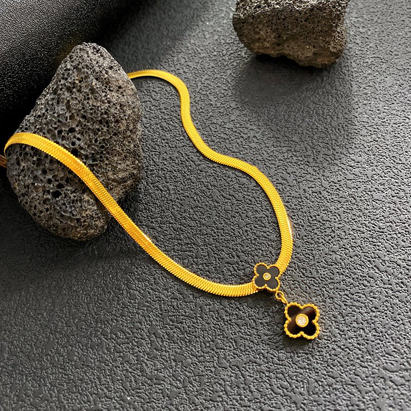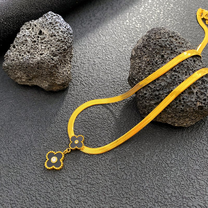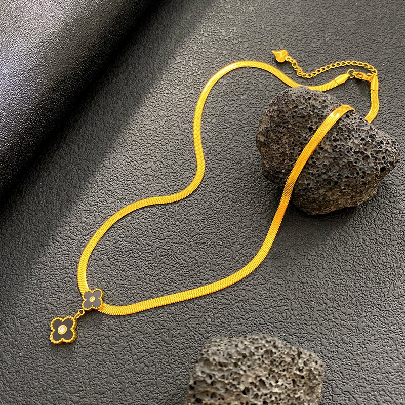 Unlock endless good fortune with HEYBIJOU’s Lucky Alhambra Clover Necklace! This captivating 18K gold-plated titanium steel piece features a mesmerizing dual four-leaf clover pendant – a bold black enamel main clover with a delicate dangling charm, both accented by a sparkling white center for that irresistible premium pop. The adjustable 40+5.5cm herringbone chain (lightweight at just 7.9g) drapes flawlessly, blending iconic lucky symbolism with modern designer vibes that make every wear feel magical and exclusive!