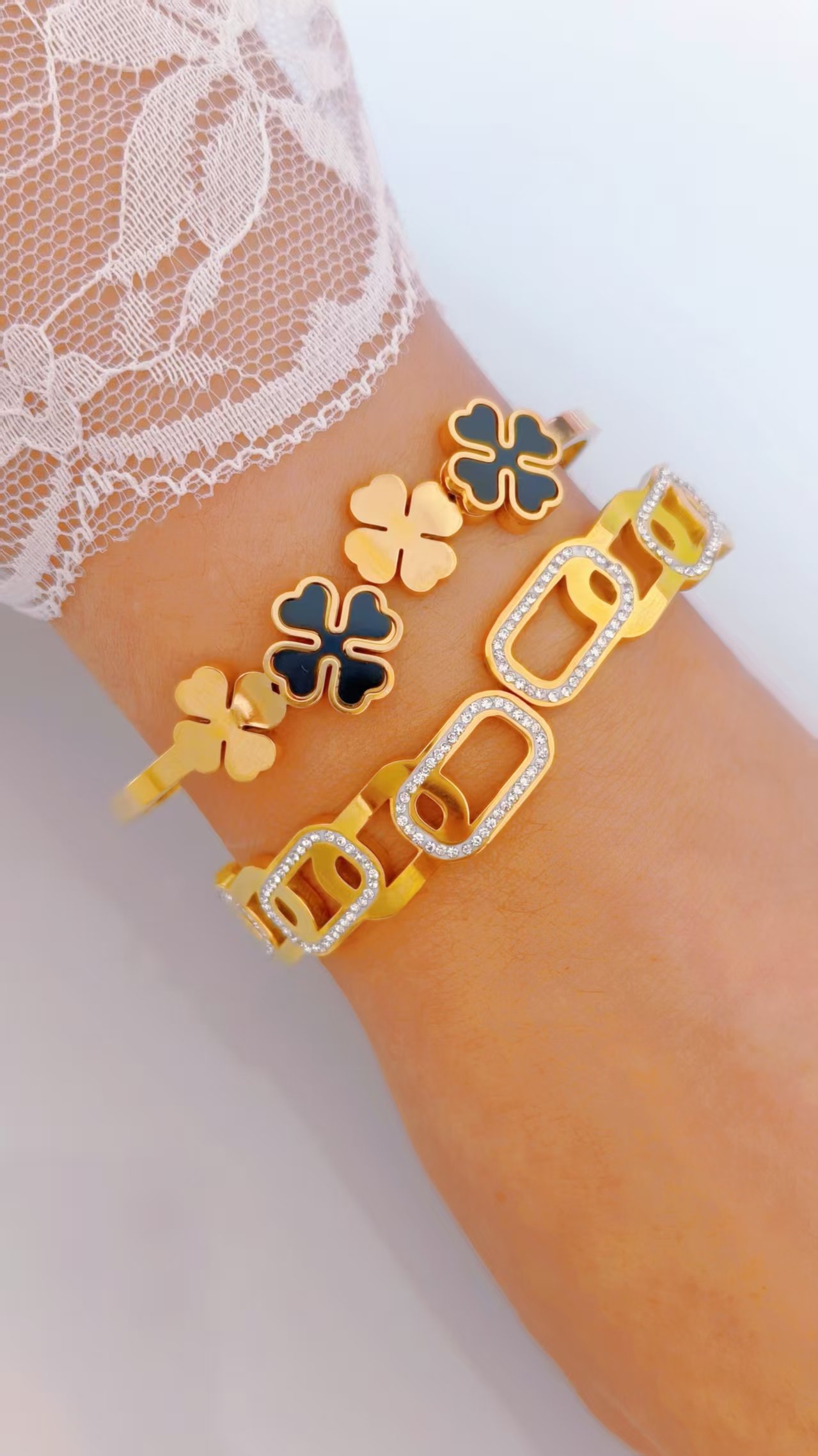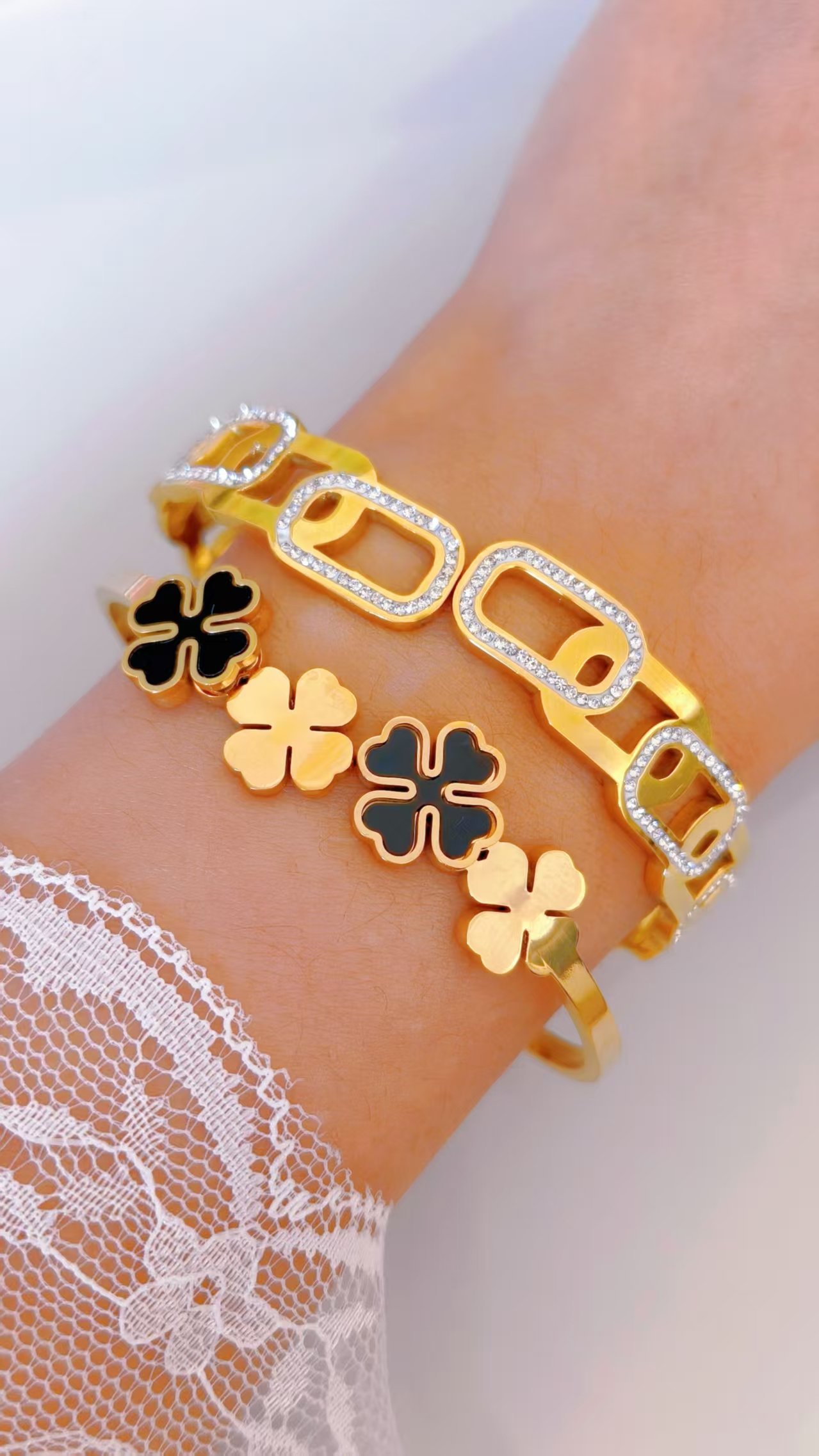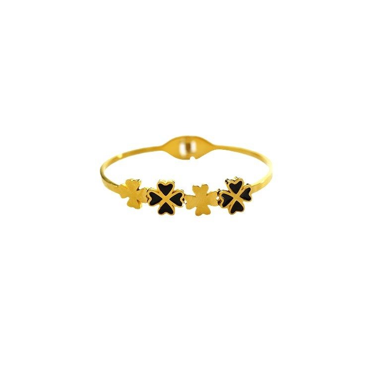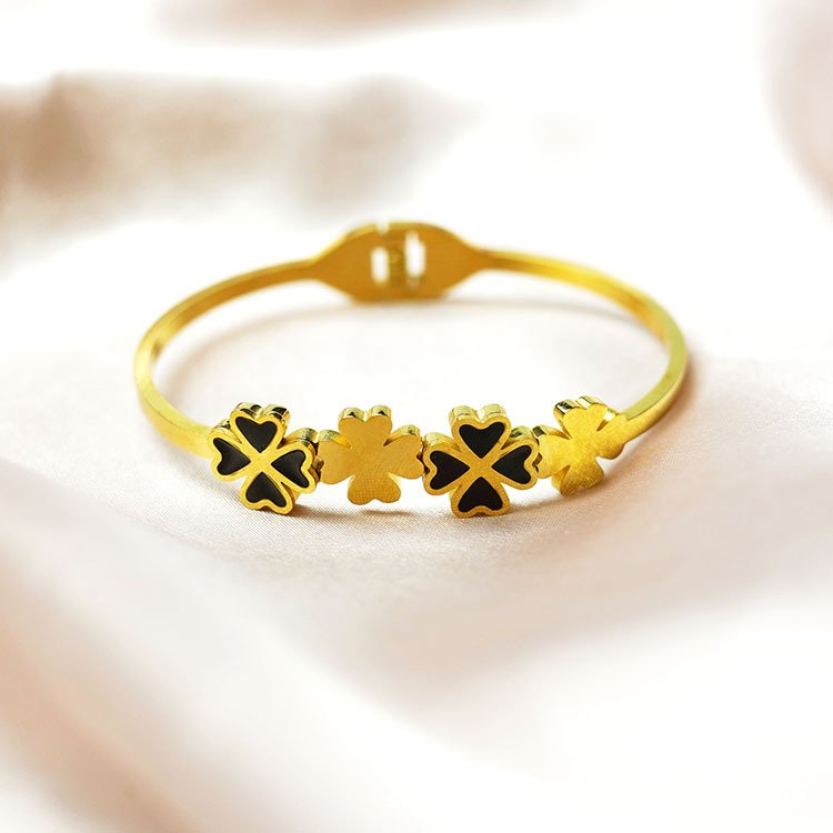 Crafted on a solid titanium steel base, this bangle is completely tarnish-free and fully water-resistant. The black enamel stays deep and glossy, the brushed gold clovers maintain their warm matte texture, and the slim band holds its bright finish through every wear and every wash. Lucky, beautiful, and built to last — exactly as a clover should be.