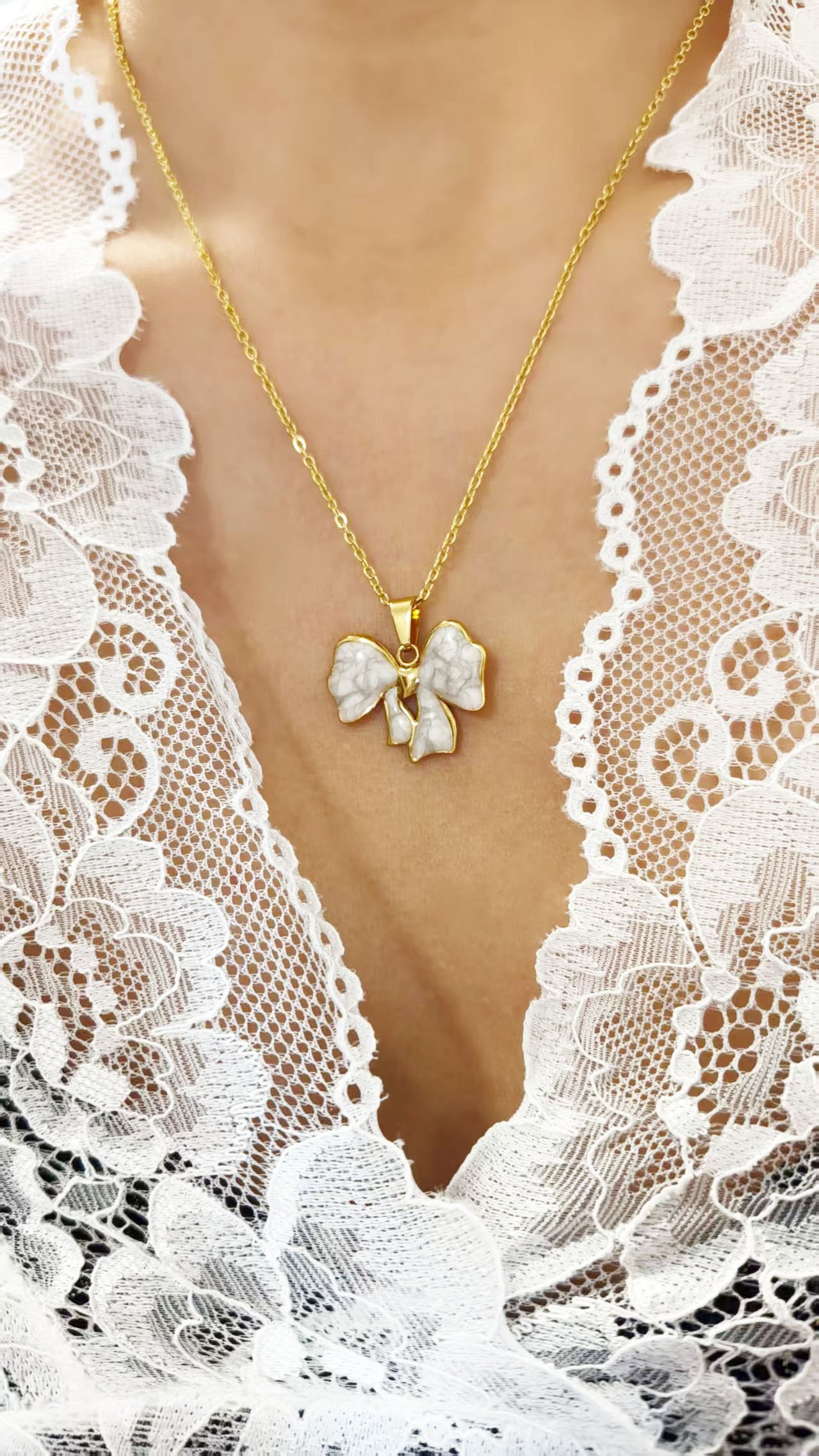 Glow up with HEYBIJOU’s Luminous Bow Set: 18K gold-plated white enamel bowknot necklace & earrings! Tarnish-free, water-resistant luxury – tie on timeless elegance today!