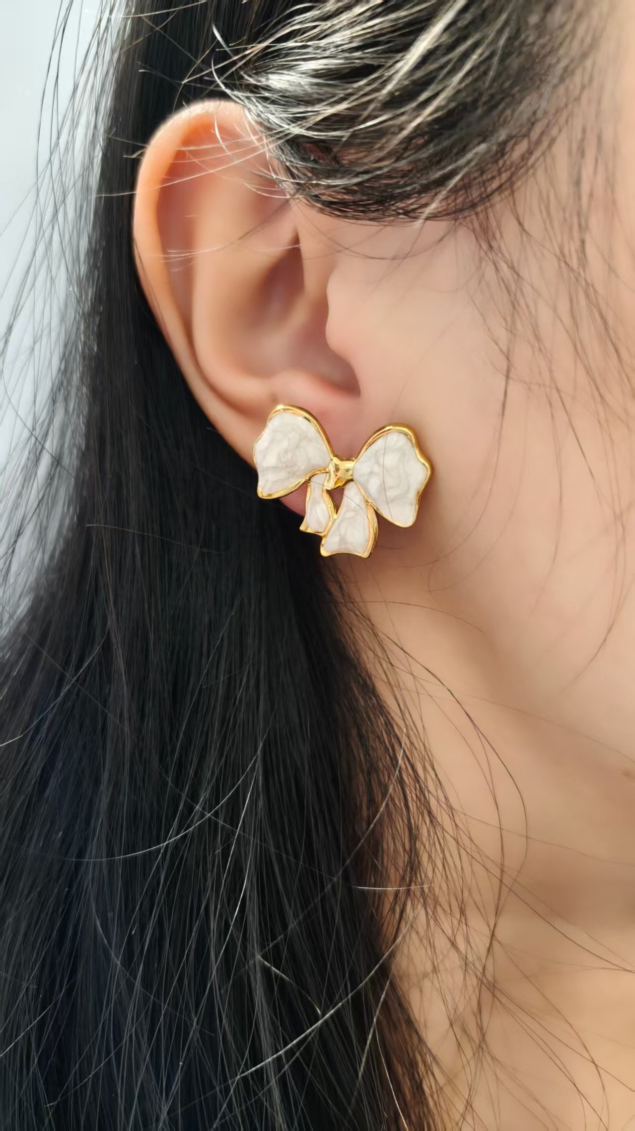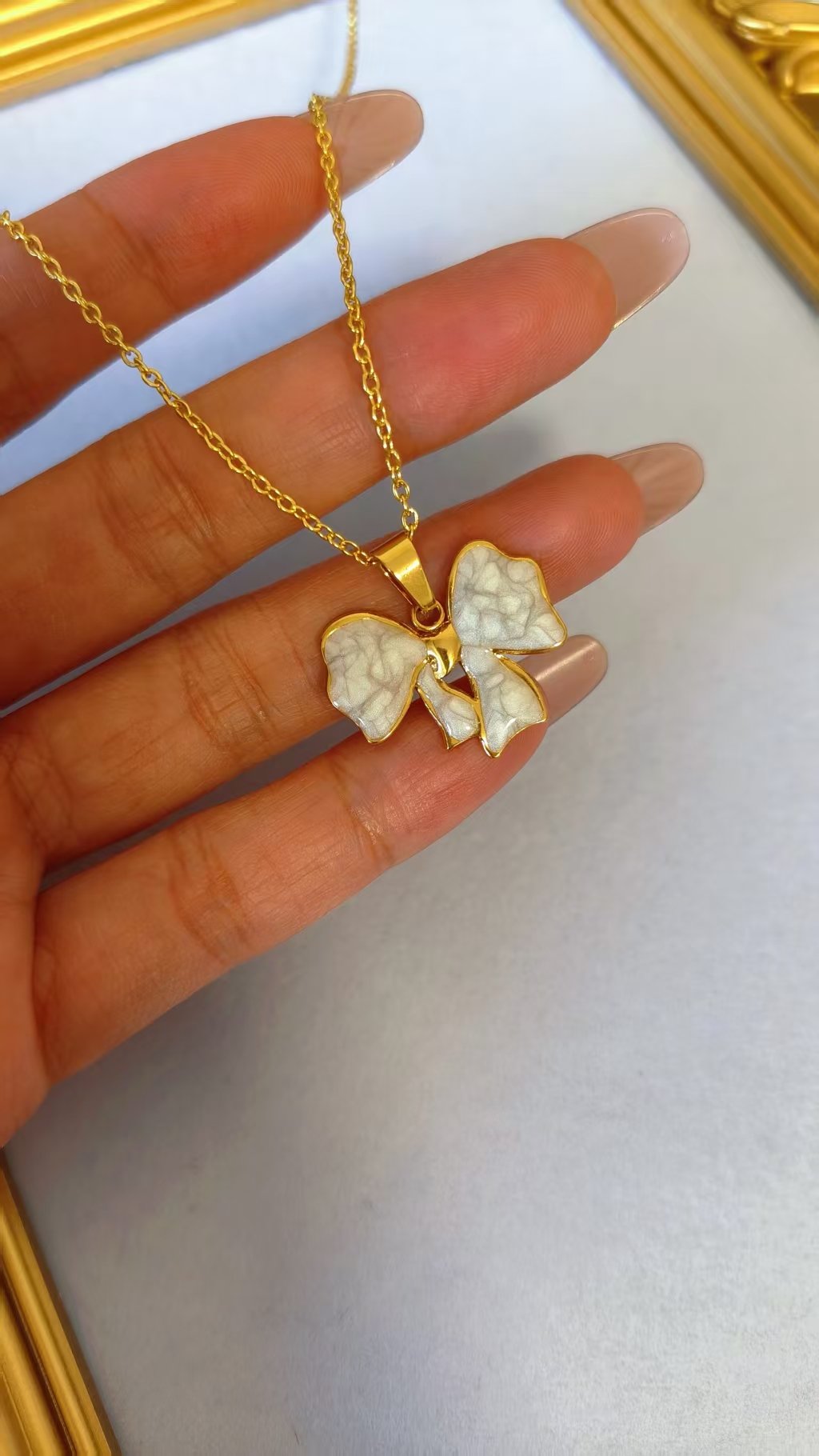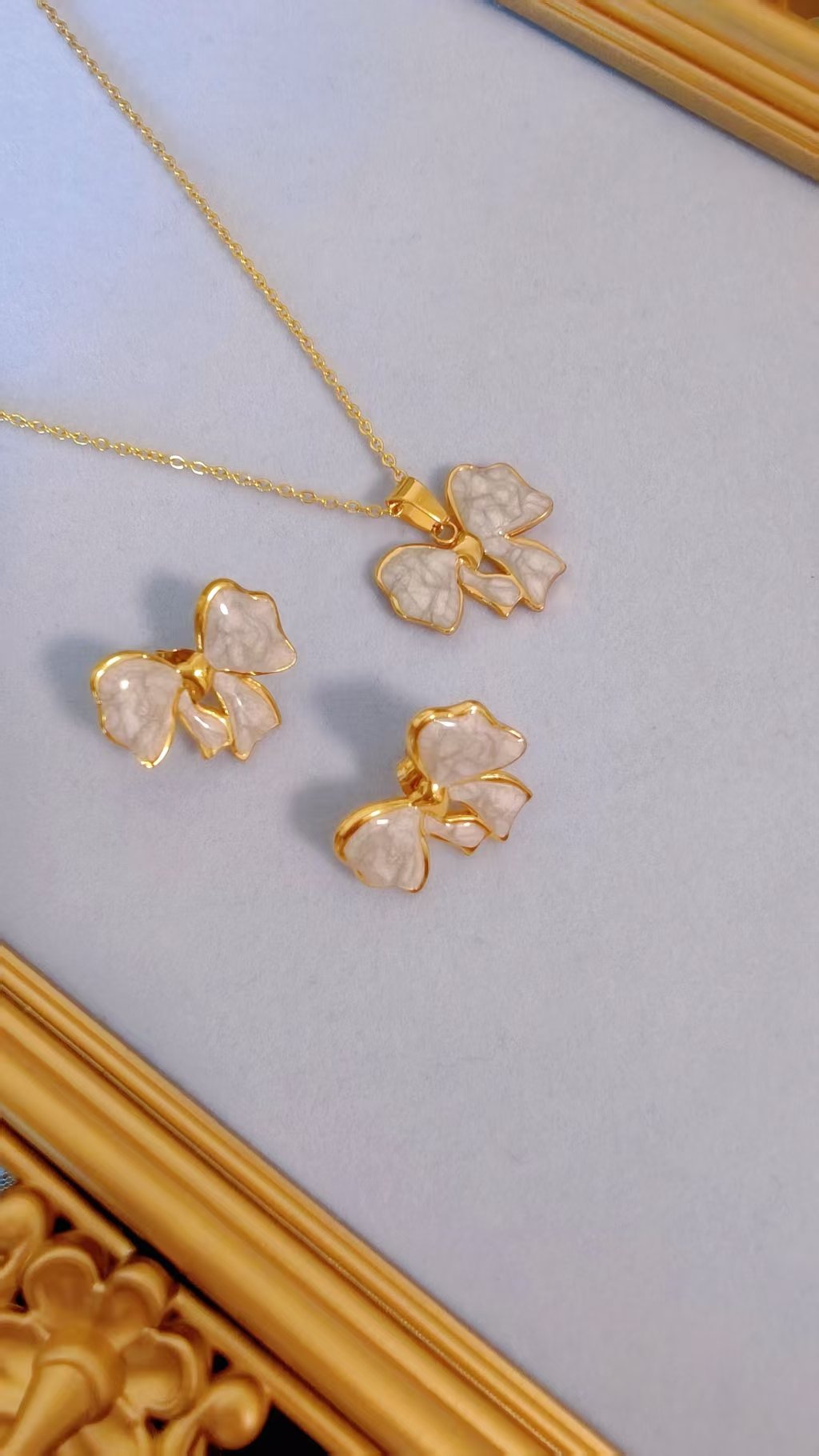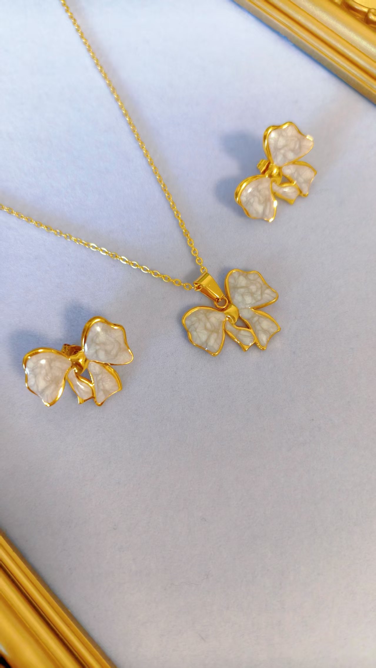 Imagine slipping on this set and instantly elevating your style – the warm 18K gold borders frame the luminous white enamel bows with exquisite detail, creating a premium, high-end look that’s both dainty and statement-making. Lightweight yet substantial, the necklace drapes beautifully while the matching stud earrings add that irresistible finishing touch. Whether layered with minimalist pieces or worn solo for maximum impact, this bow set screams timeless luxury and effortless chic!