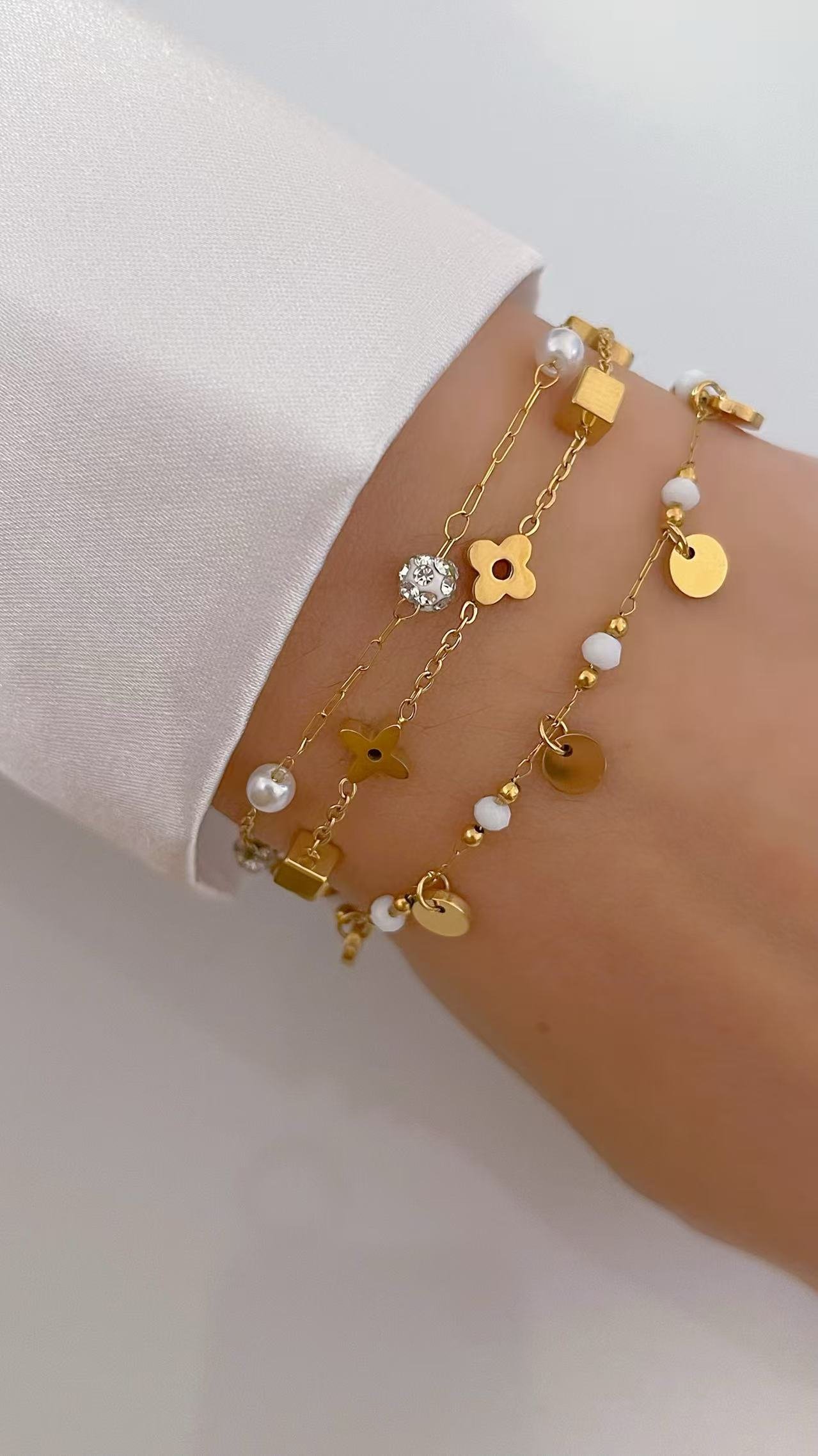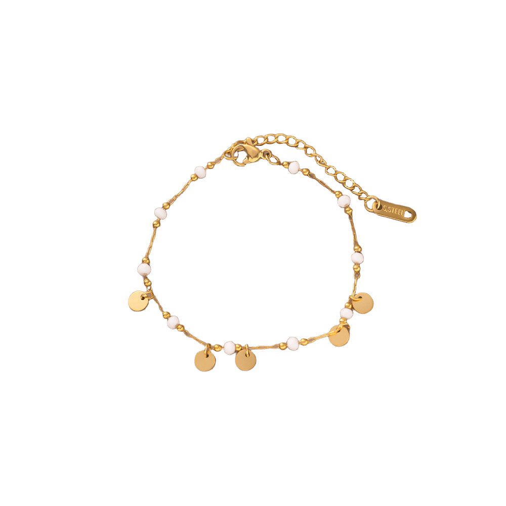 Dainty HEYBIJOU Luminous Pearl Disc Chain: 18K gold-plated titanium steel with glowing beads & swaying discs. Tarnish-free, water-resistant—whimsical luxury that lasts!