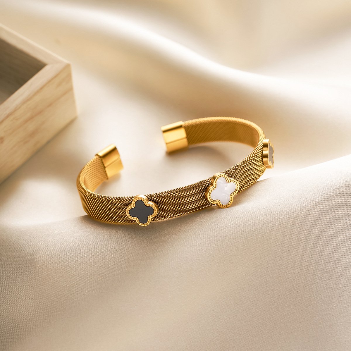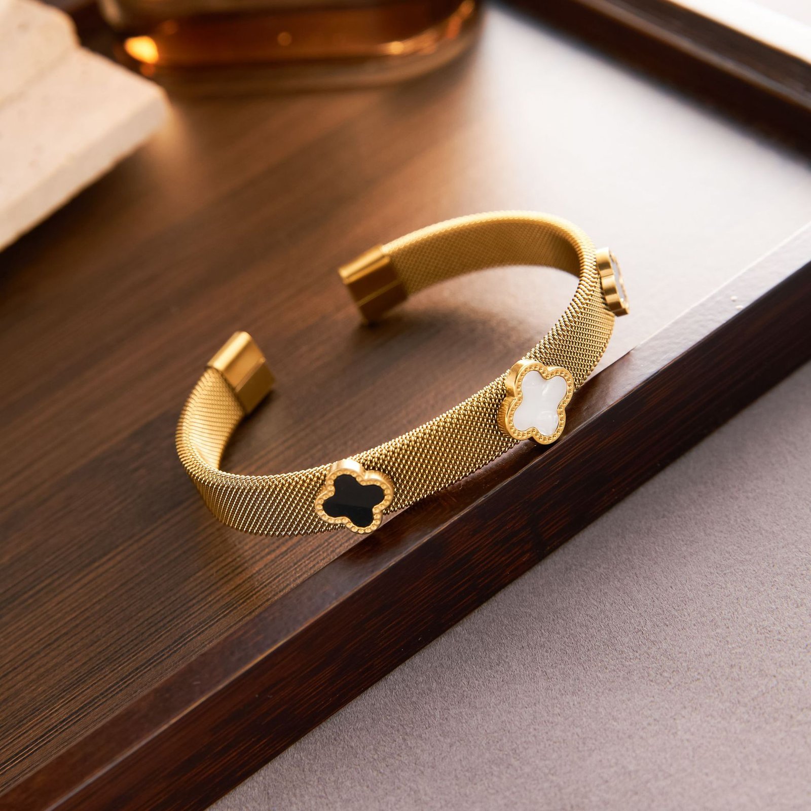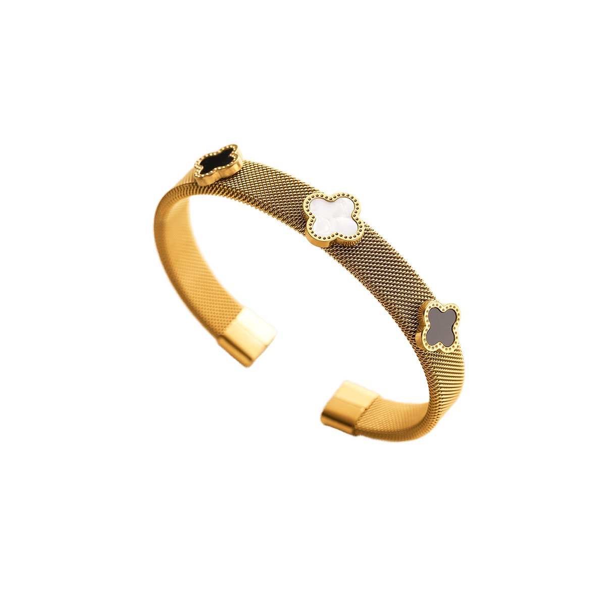 Gold mesh cuff bangle with triple shell clover inlays — black, white & grey. Tarnish-free, water-resistant & seriously luxurious.