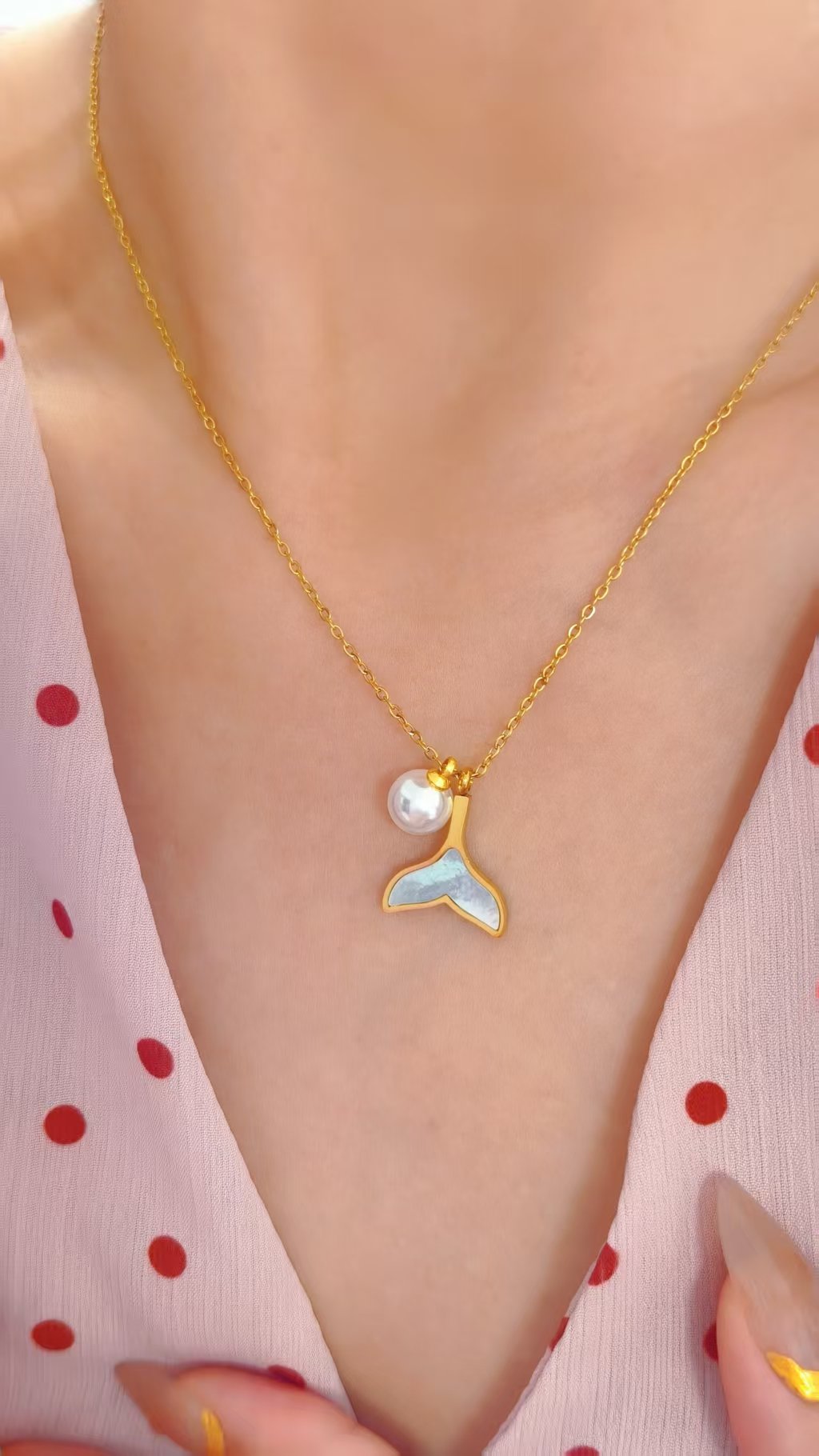 Two Pendants, One Perfect Pairing The star of this necklace is the mother of pearl mermaid tail — framed in a sleek 18K gold outline, its interior shimmers with the soft, milky iridescence that only genuine mother of pearl can deliver. It glows differently in every light, shifting from white to cream to the faintest blush depending on how the sun hits it. Beside it, a single lustrous pearl charm dangles with timeless grace, its round, smooth surface adding a touch of classic sophistication that balances the whimsy of the tail perfectly. These two charms weren’t just designed together — they were made for each other.