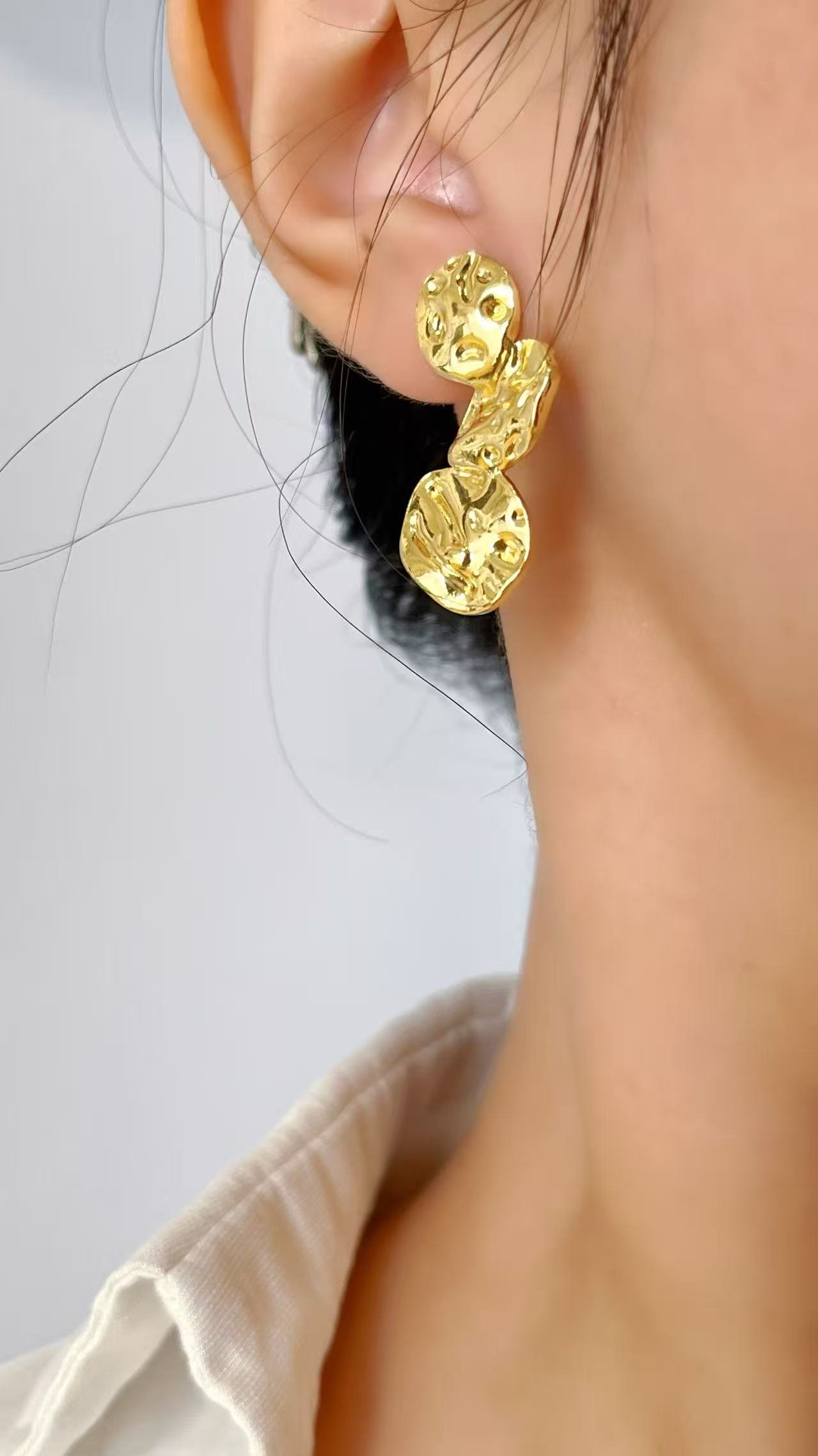 Unleash molten magic with HEYBIJOU’s 18K gold-plated titanium earrings—tarnish-free, water-resistant textured cascades for bold, effortless glow. Lightweight luxury that drips with style!