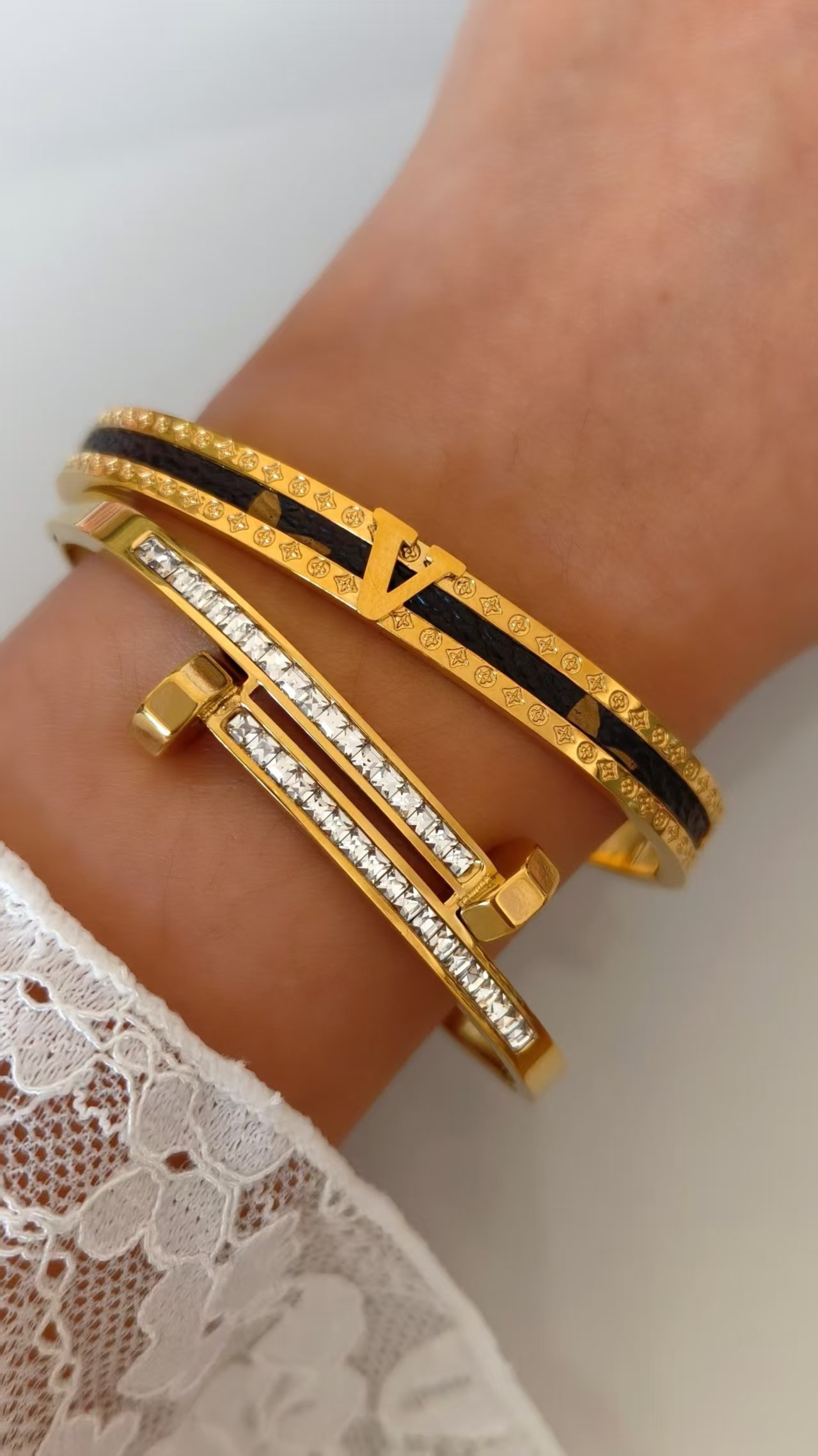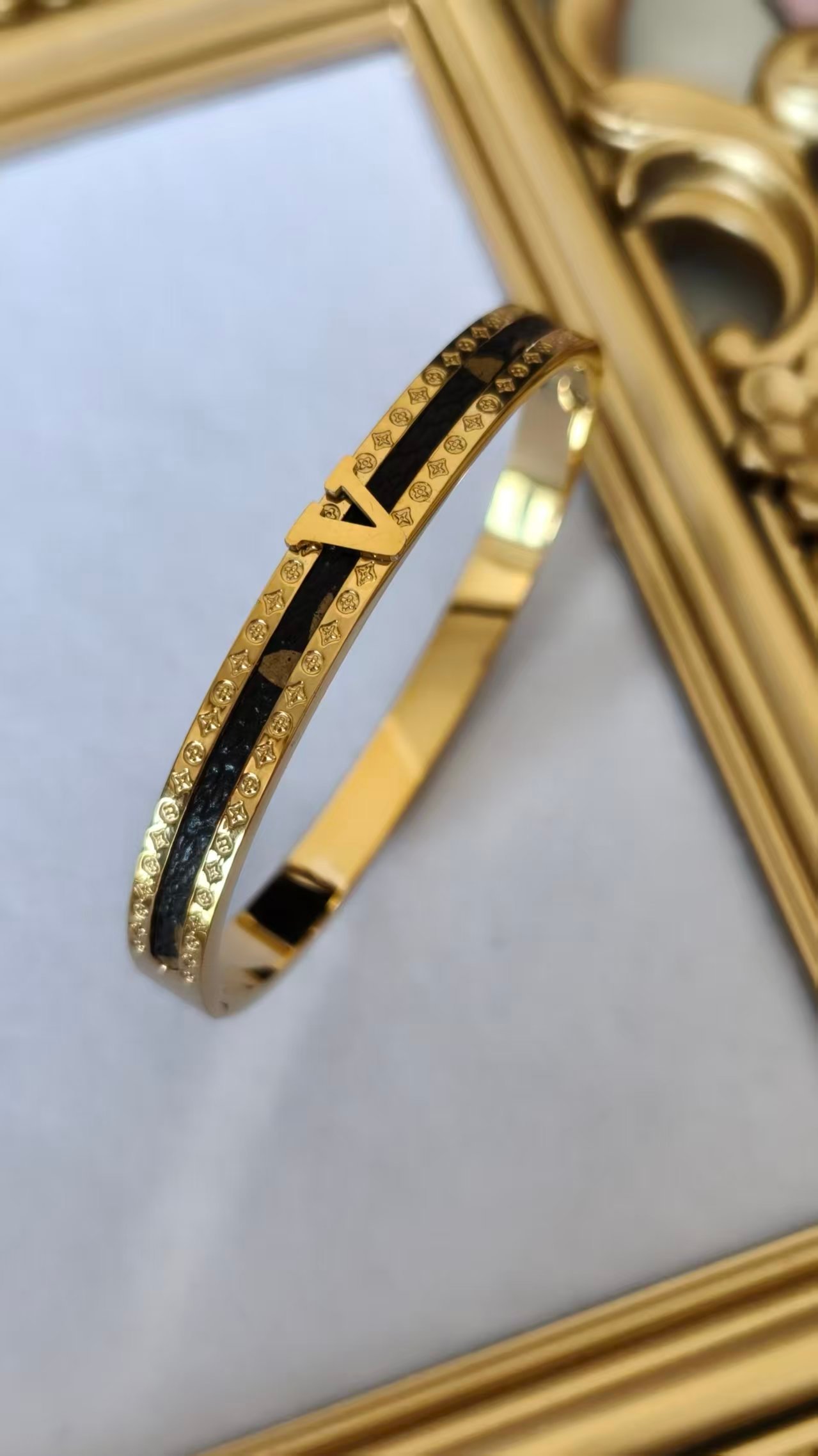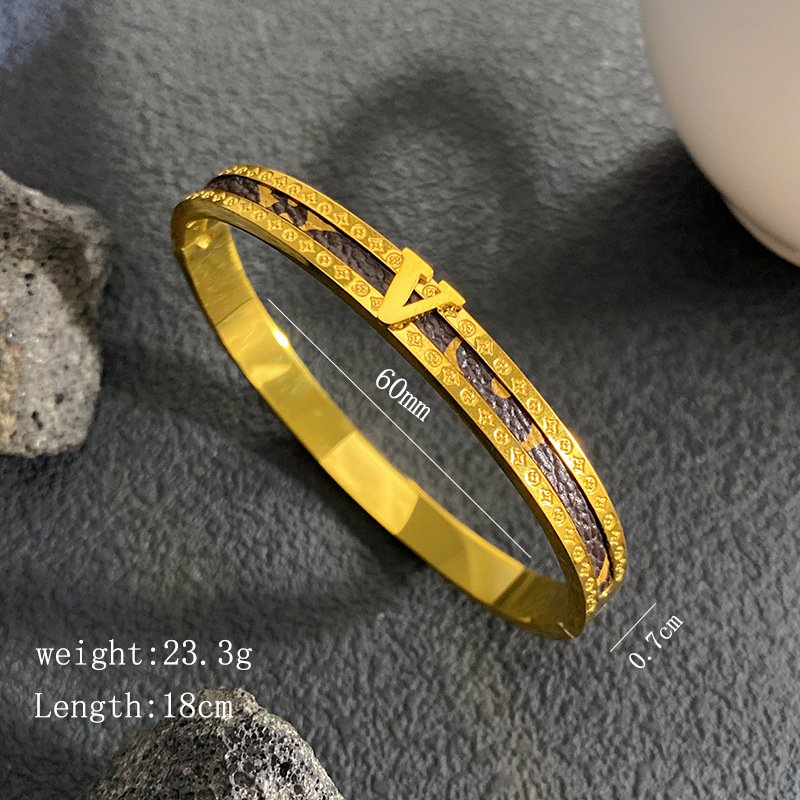 Unlock luxury with HEYBIJOU’s Monogram V Leather Bangle: 18K gold-plated titanium steel cuff with brown leather inlay & clover V charm! Tarnish-free, water-resistant – own iconic elegance now!