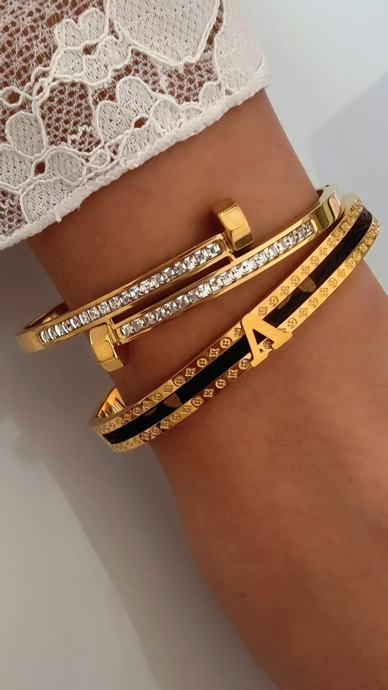Feel the opulence in every element – the warm 18K gold shine contrasts beautifully against the textured leather and intricate clover motifs, creating a luxurious, monogram-inspired look that’s both modern and heirloom-worthy. The substantial yet refined design (0.7cm width) offers that coveted high-fashion cuff presence without overwhelming your stack. Whether worn solo for understated luxury or layered with your favorites, this bangle exudes confidence, exclusivity, and pure glamour – a true investment in everyday elegance!