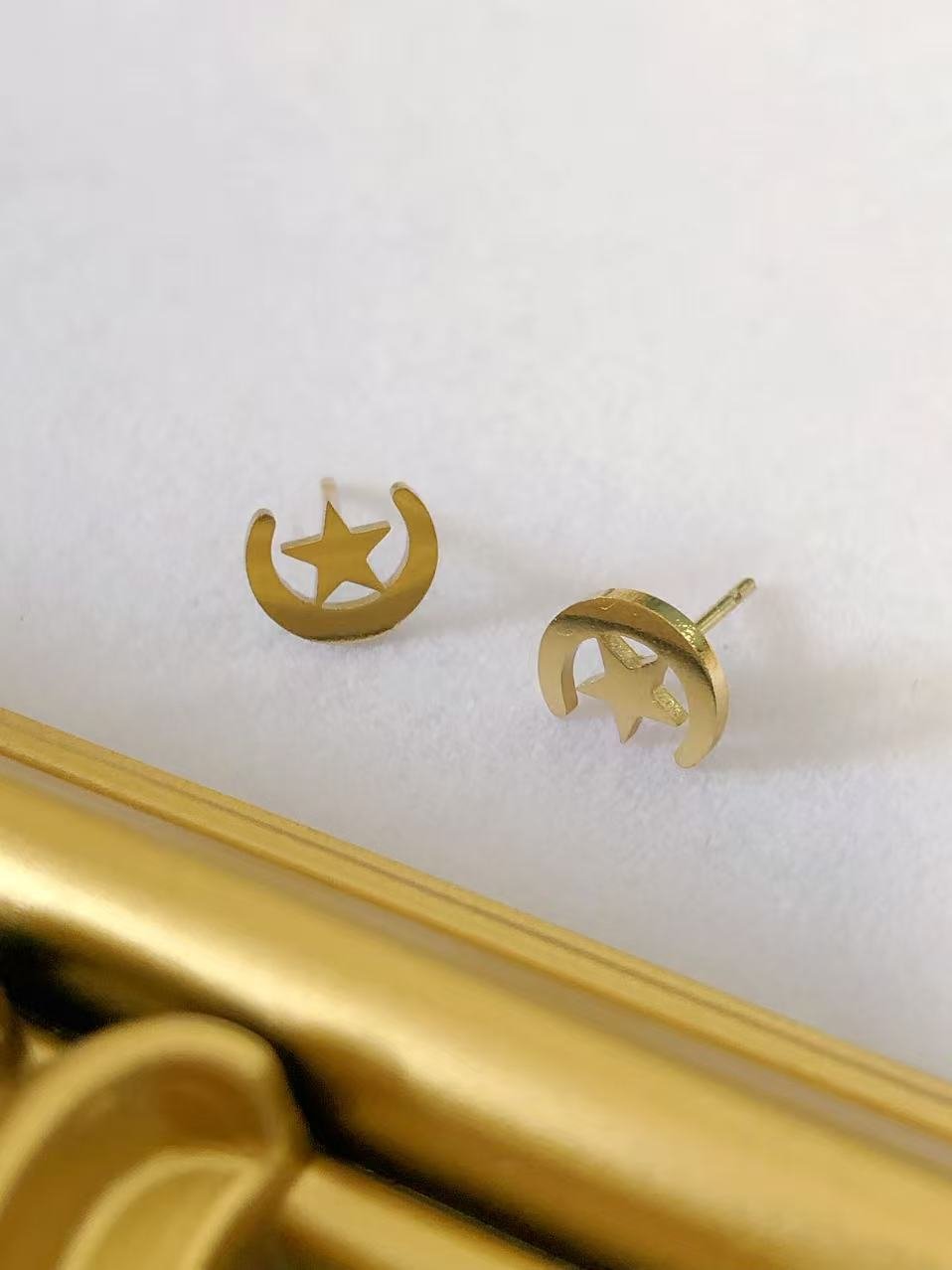 Gold moon and star stud earrings in 18k gold. Celestial crescent design, tarnish-free & water-resistant. Dreamy cosmic jewelry. Shop now!