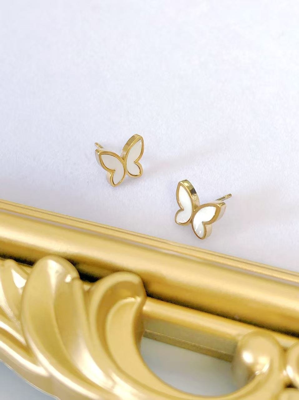 Mother of pearl butterfly stud earrings in 18k gold. Natural shell inlay wings, tarnish-free frame. Elegant transformation jewelry!