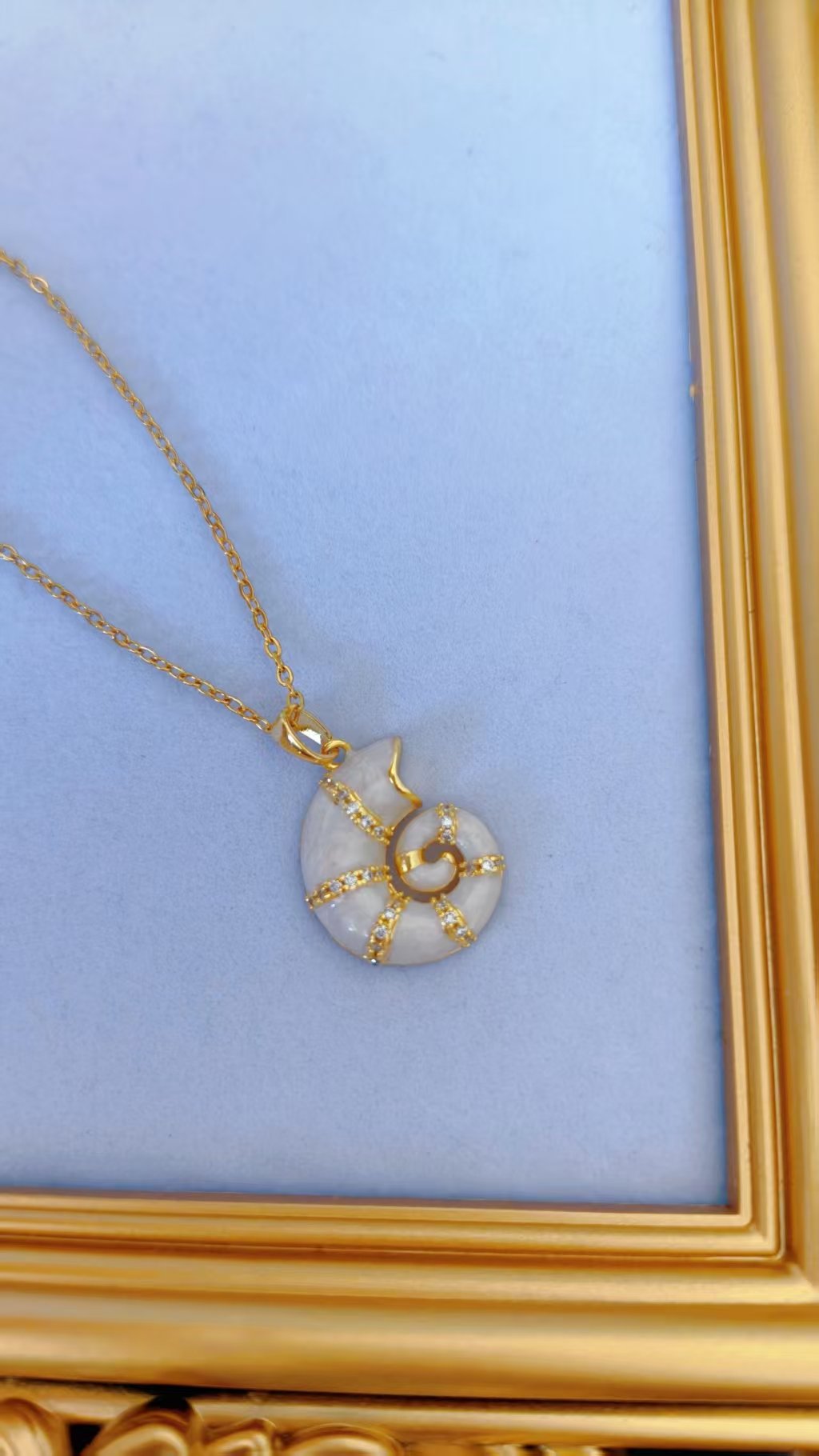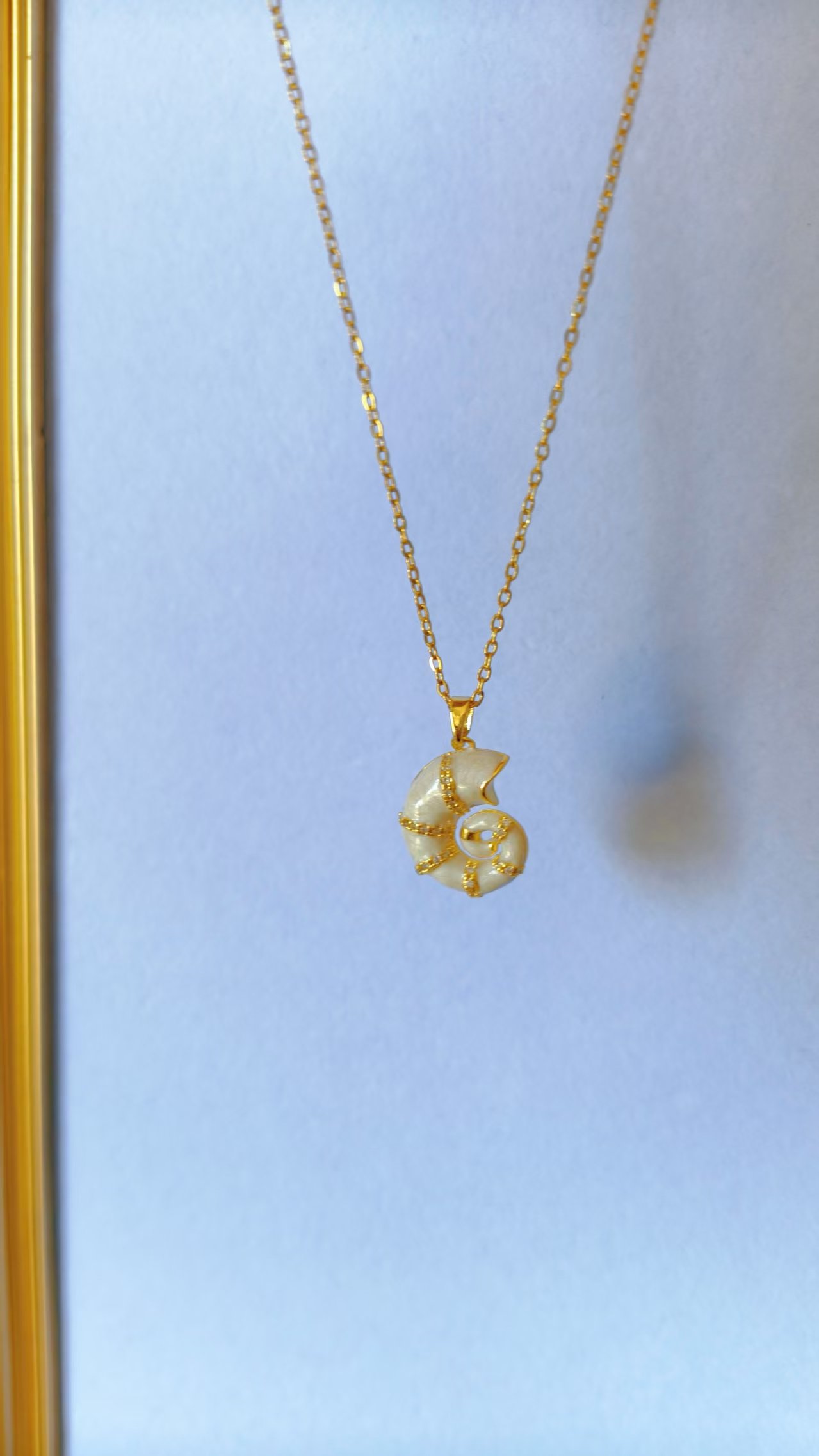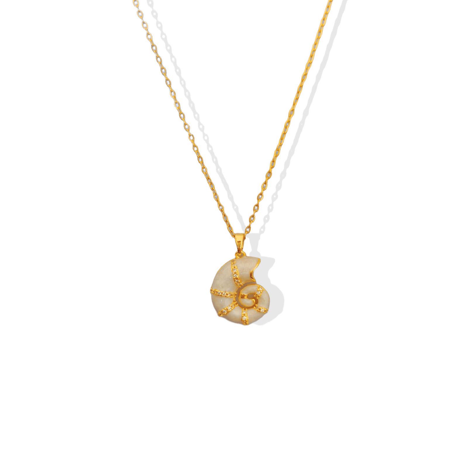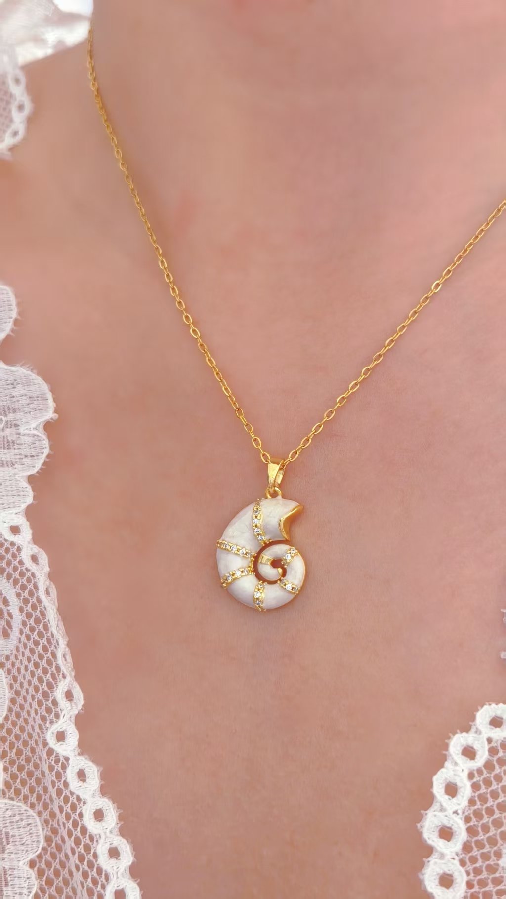 White enamel nautilus shell necklace with pavé zircon spiral in 18K gold — tarnish-free & water-resistant. Wear the ocean’s perfection. 🐚✨