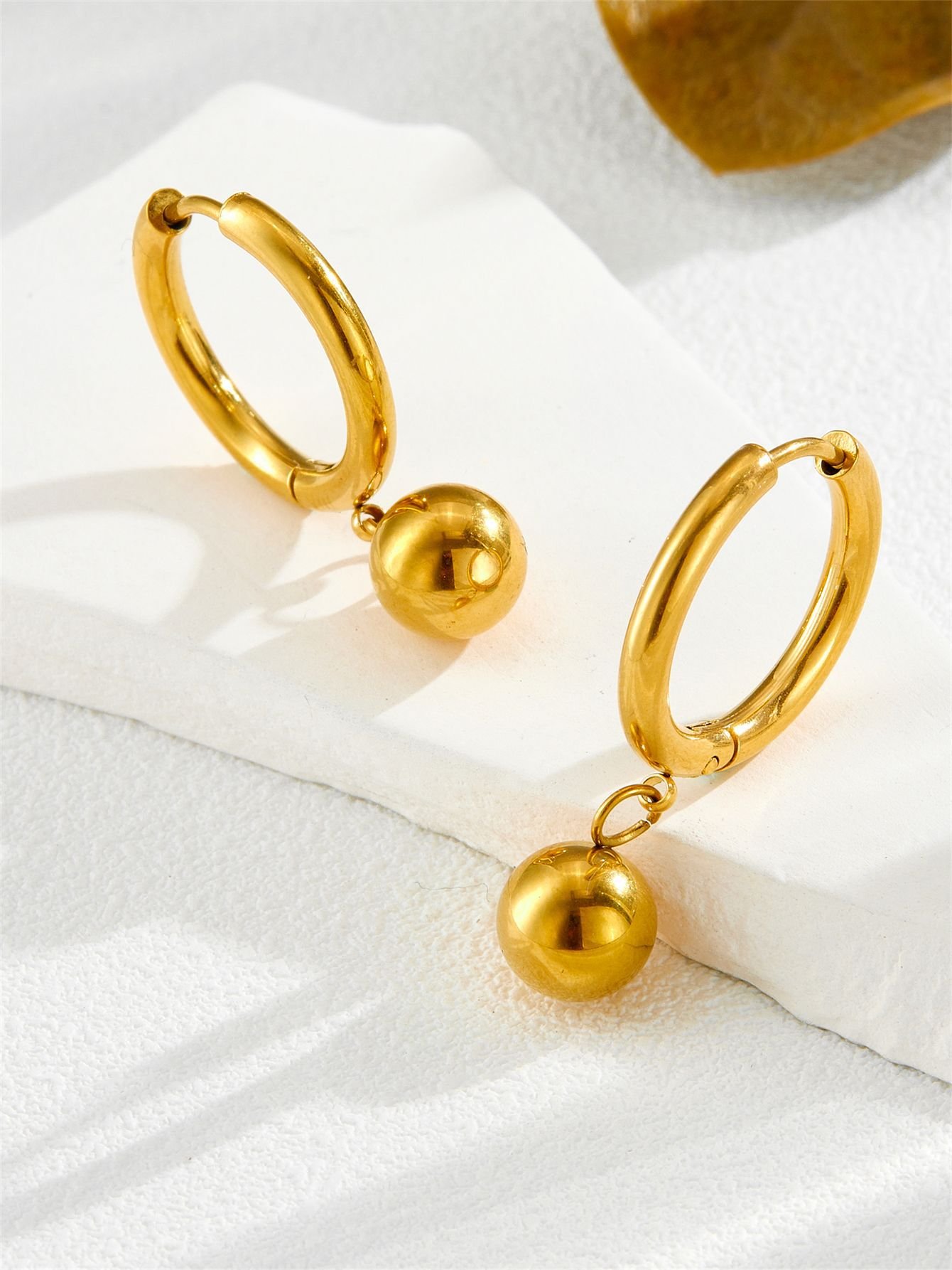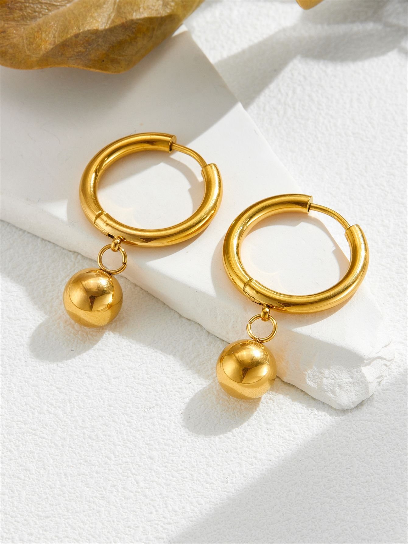 Suspended from the base of the hoop, a generously sized round gold sphere drops with a satisfying, gentle sway — perfectly round, mirror-polished, and catching warm 18K gold light from every angle simultaneously. The sphere is the design — bold in its simplicity, luxurious in its finish, and completely iconic in the way that only the most elementally beautiful shapes can be. It moves with you, glows for you, and never stops looking expensive.
