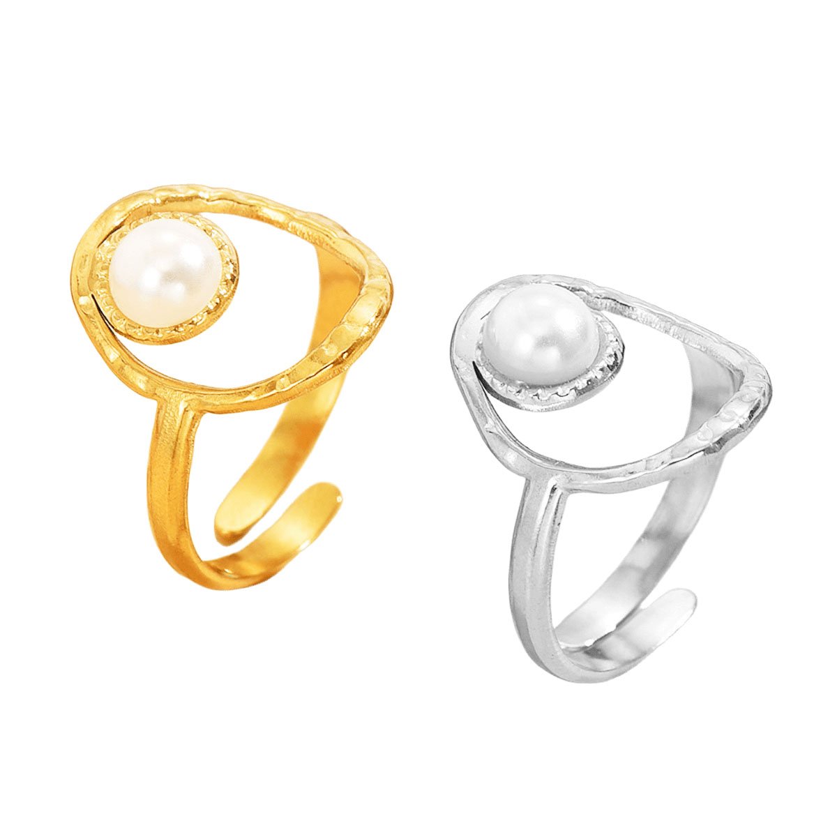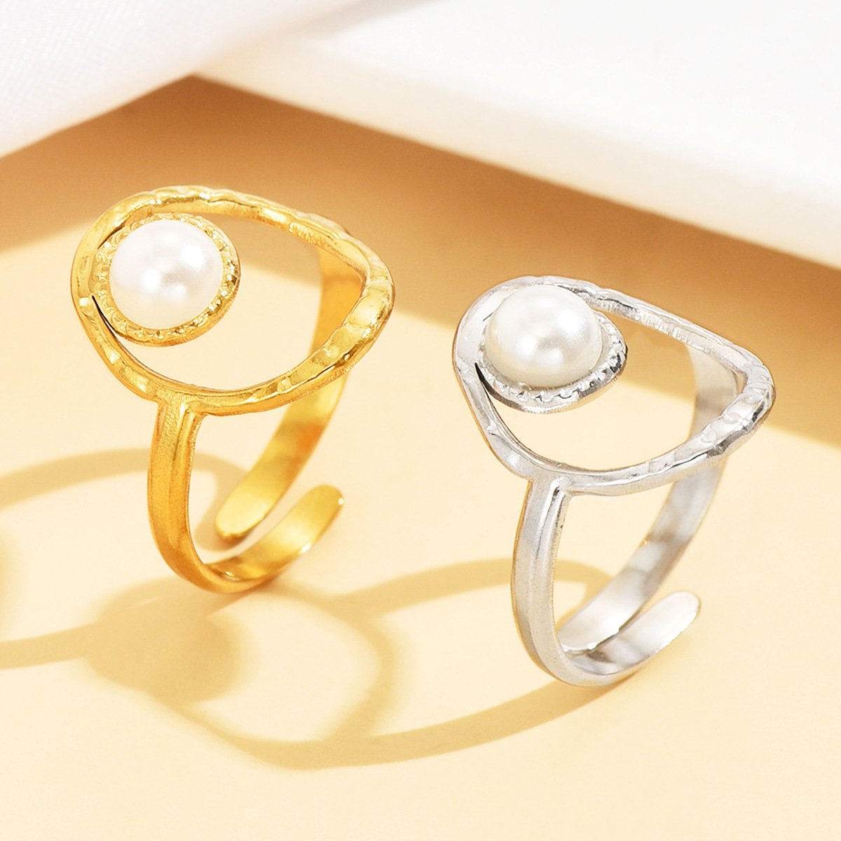 Hammered gold/silver circle with floating real pearl. Tarnish-free, waterproof titanium steel luxury. Adjustable open fit – pure elegance!