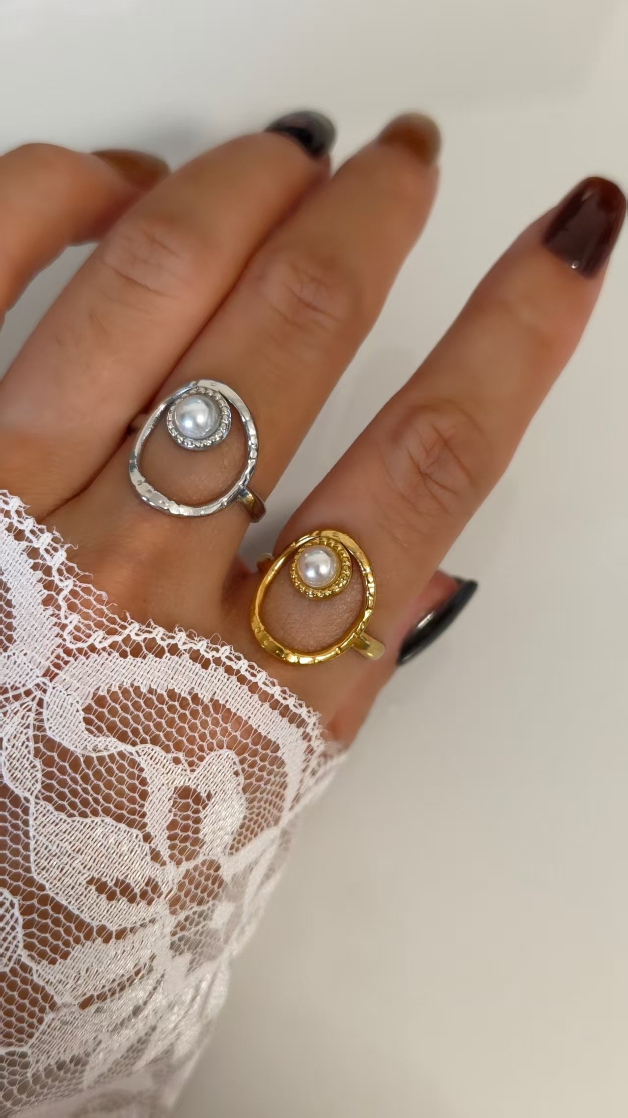 The Orbit Pearl Halo Ring – one luminous freshwater pearl suspended in a perfectly imperfect hammered circle that floats above your finger like a modern moon. Clean, sculptural, and instantly iconic.