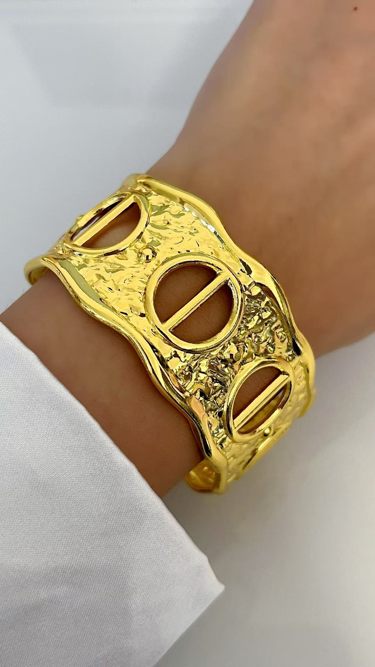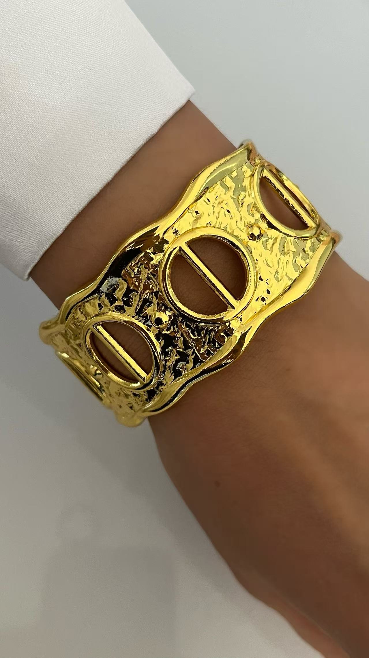 Organic cutout statement cuff bracelet in 18k gold. Sculptural design, adjustable fit, tarnish-free. Bold art jewelry. Shop HEYBIJOU now!