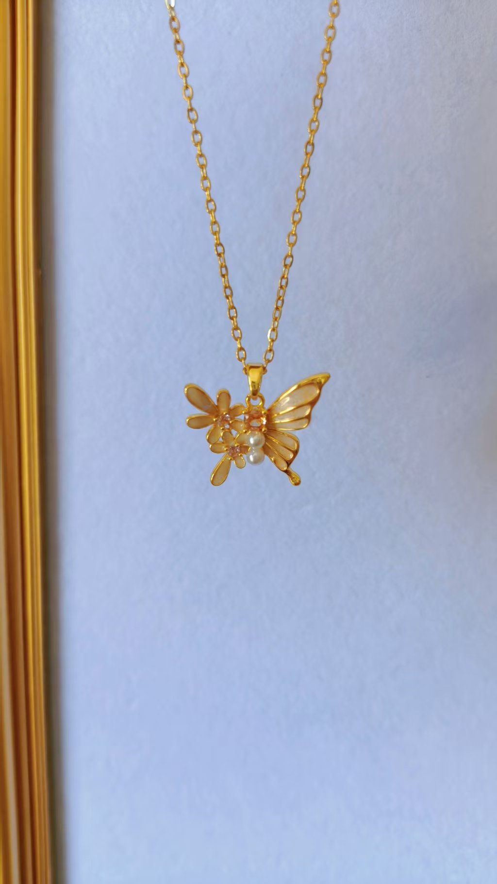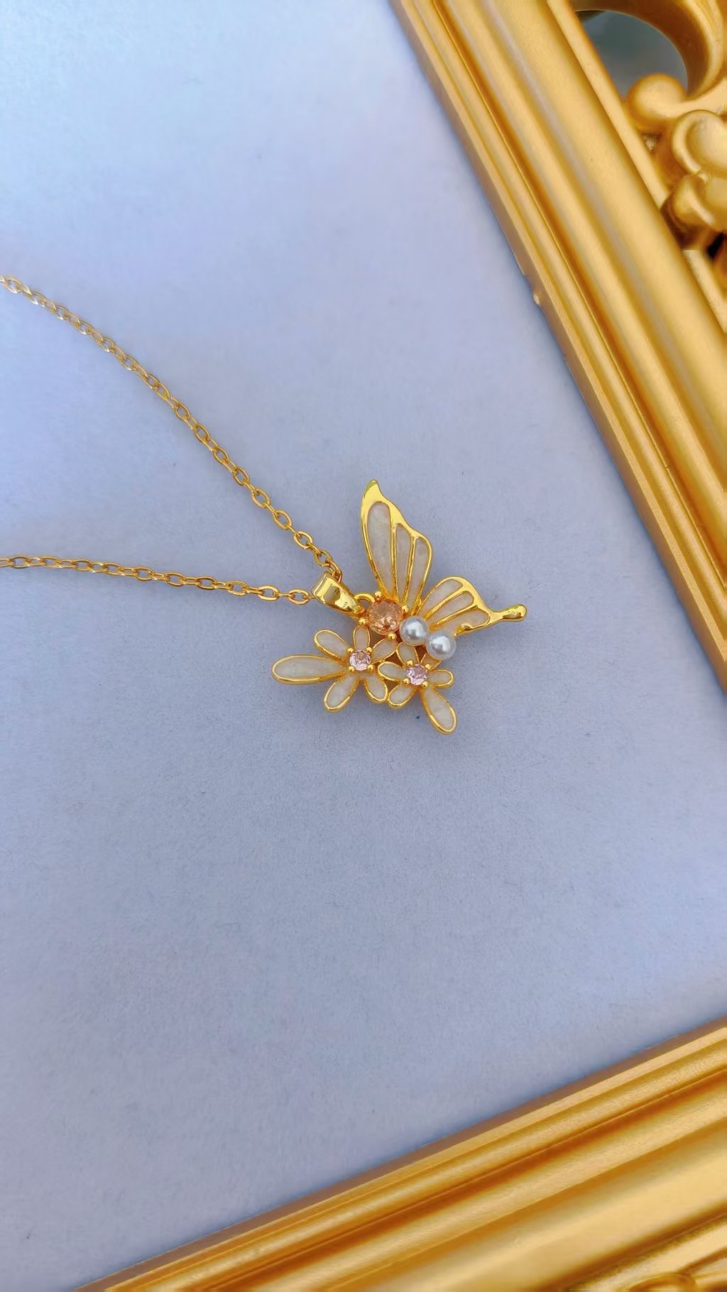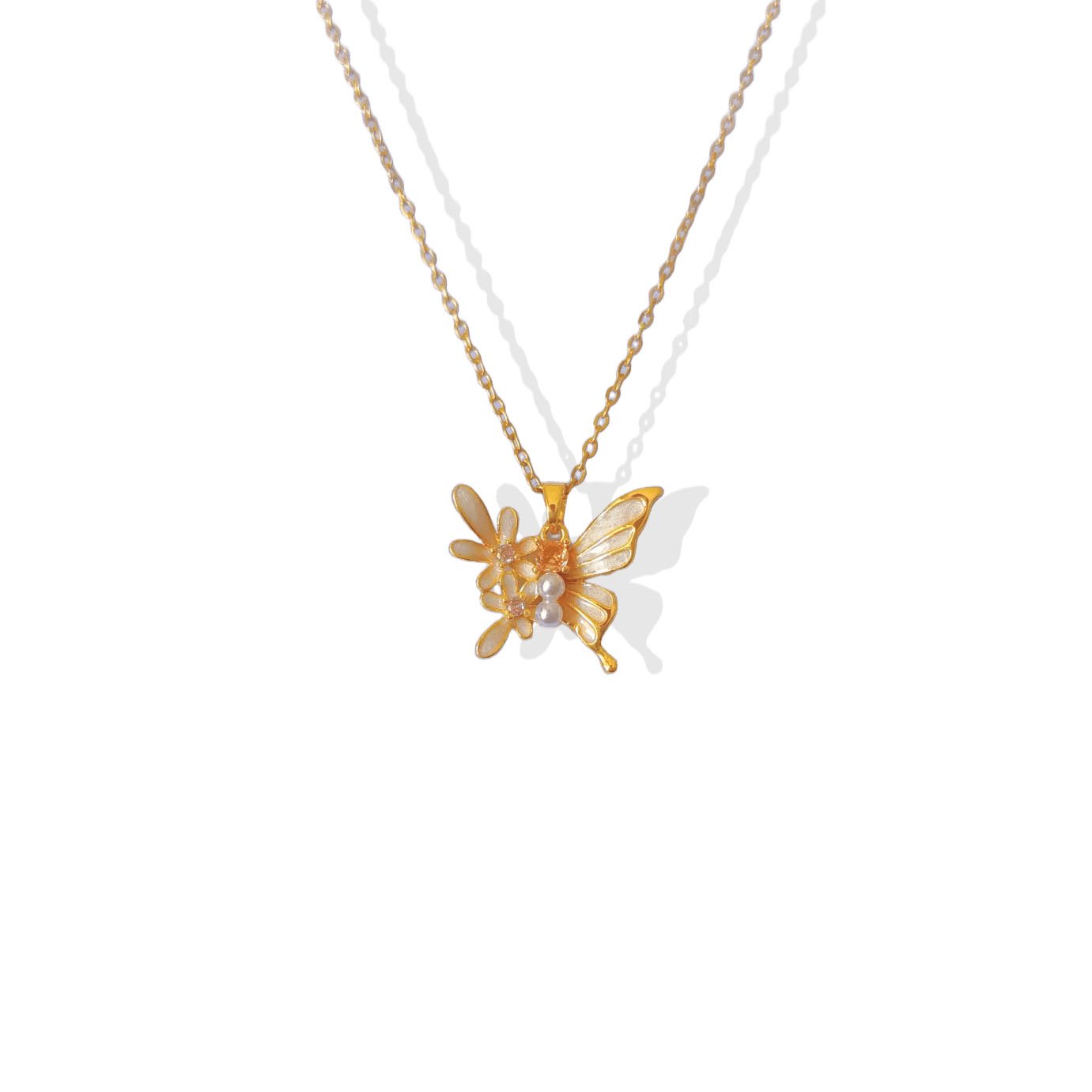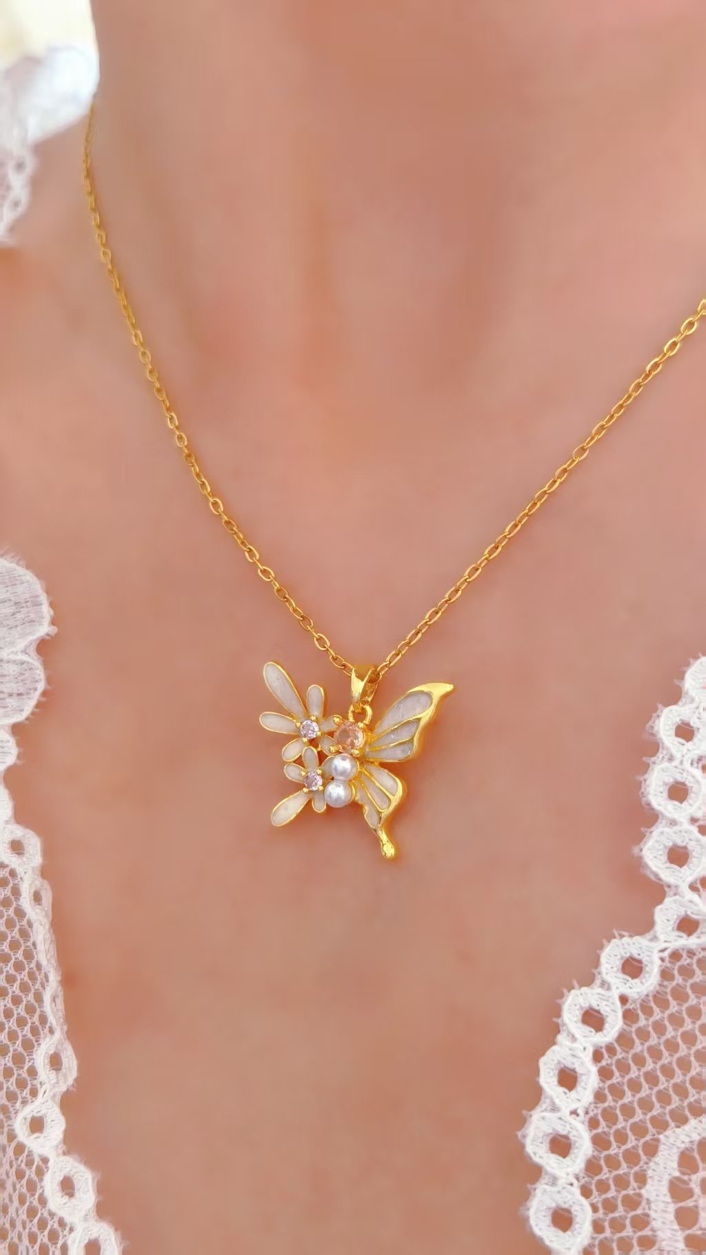 The Papillon Bloom Necklace is crafted from titanium steel with 18K gold PVD plating — every gossamer-thin wing and every seed pearl held in place by construction that is far stronger than it appears:
